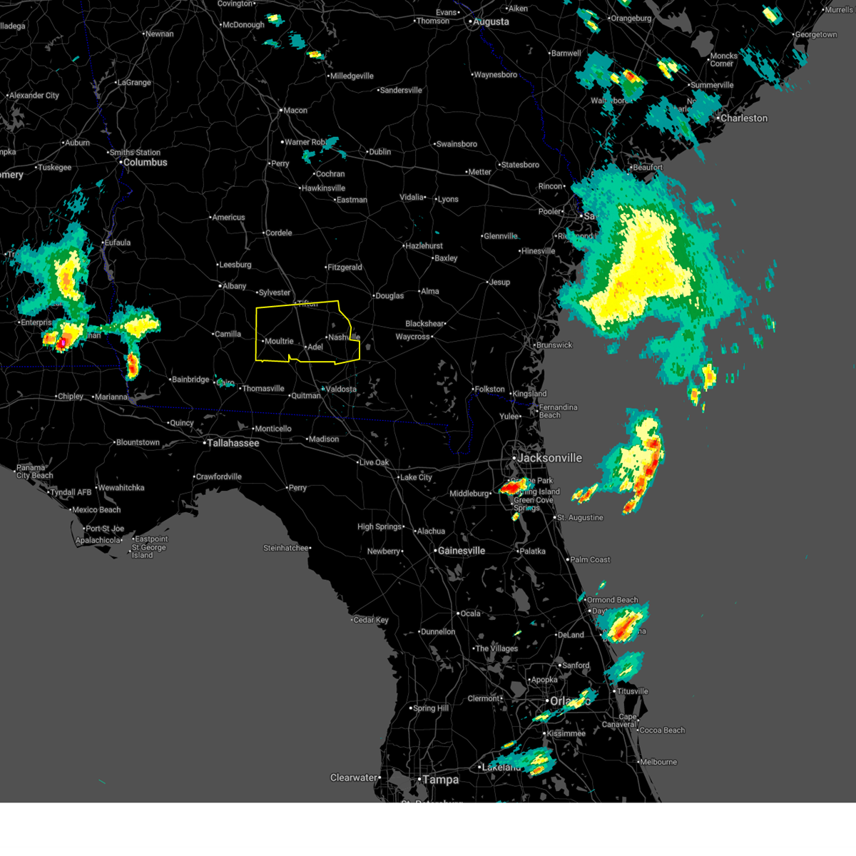 At 637 pm edt, doppler radar indicated a line of severe thunderstorms capable of producing damaging winds in excess of 60 mph. these storms were located along a line extending from near riverside to near douglas, moving southeast at 25 mph. locations impacted include, moultrie, lakeland, adel, nashville, sparks, enigma, omega, ray city, norman park, lenox, doerun, alapaha, riverside, schley, meigs, berlin, funston, cecil, ellenton and allenville.