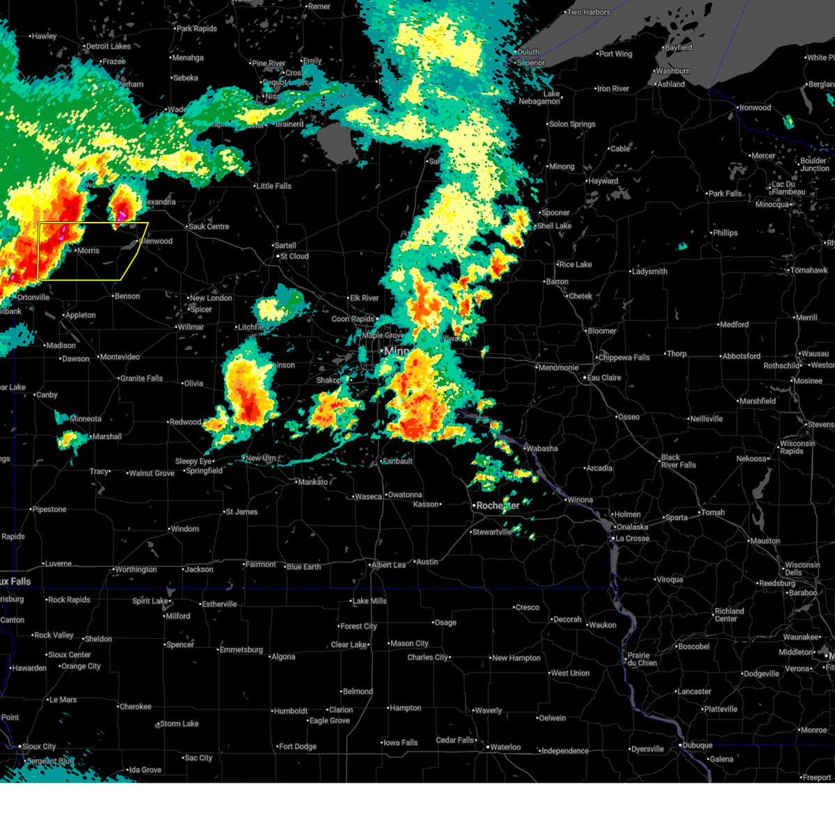At 635 pm cdt, severe thunderstorms were located along a line extending from near johnson to 5 miles southwest of hancock to 5 miles west of raymond, moving north at 75 mph. these are destructive storms for benson and morris (radar indicated). Hazards include 90 mph wind gusts. You are in a life-threatening situation. flying debris may be deadly to those caught without shelter. mobile homes will be heavily damaged or destroyed. homes and businesses will have substantial roof and window damage. expect extensive tree damage and power outages. these severe storms will be near, hancock and chokio around 640 pm cdt. morris, cyrus and murdock around 645 pm cdt. donnelly around 650 pm cdt. brooten around 700 pm cdt. thunderstorm damage threat, destructive hail threat, radar indicated max hail size, <. 75 in wind threat, radar indicated max wind gust, 90 mph.