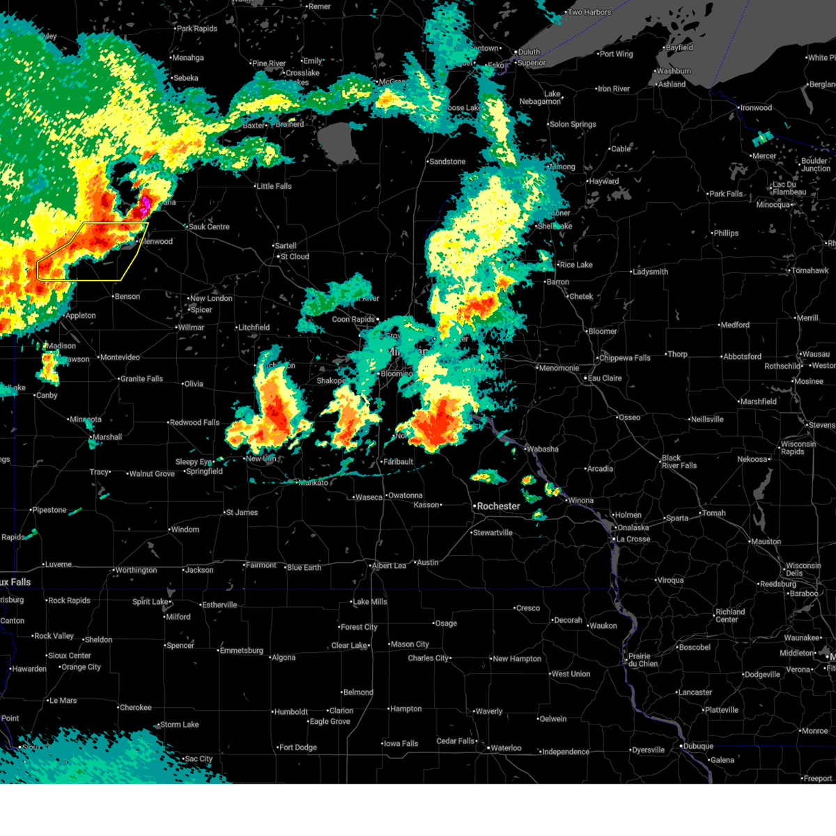 At 615 pm cdt, severe thunderstorms were located along a line extending from near milbank to 6 miles southwest of appleton to near hanley falls, moving northeast at 85 mph. these are destructive storms for appleton and benson (radar indicated. at 608 pm cdt, madison airport reported a gust of 94 mph). Hazards include 100 mph wind gusts. You are in a life-threatening situation. flying debris may be deadly to those caught without shelter. mobile homes will be destroyed. expect considerable damage to homes and businesses. expect extensive tree damage and power outages. severe thunderstorms will be near, granite falls and appleton around 620 pm cdt. maynard and lake oliver around 625 pm cdt. clara city around 630 pm cdt. hancock and raymond around 635 pm cdt. kerkhoven, chokio and cyrus around 640 pm cdt. thunderstorm damage threat, destructive hail threat, radar indicated max hail size, <. 75 in wind threat, observed max wind gust, 100 mph.