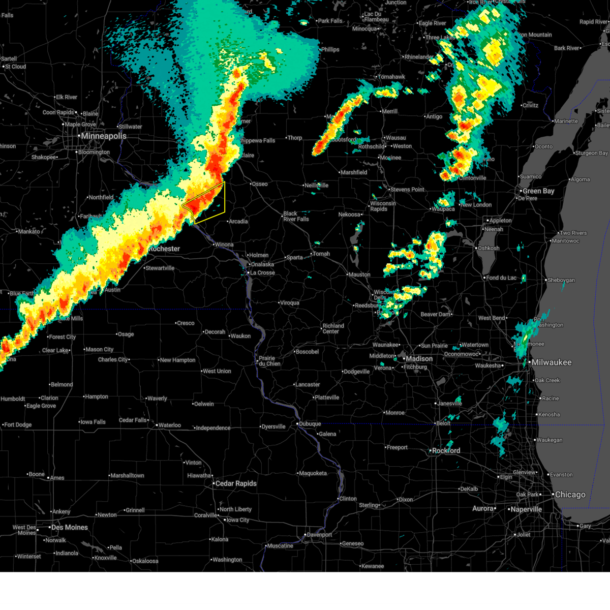 Svrarx the national weather service in la crosse has issued a * severe thunderstorm warning for, buffalo county in west central wisconsin, la crosse county in west central wisconsin, western jackson county in west central wisconsin, northwestern monroe county in west central wisconsin, trempealeau county in west central wisconsin, * until 715 pm cdt. * at 609 pm cdt, severe thunderstorms were located along a line extending from near plainview to near rollingstone to near rushford to near mabel, moving northeast at 70 mph (radar indicated). Hazards include 70 mph wind gusts and penny size hail. Expect considerable tree damage. damage is likely to mobile homes, roofs, and outbuildings. severe thunderstorms will be near, winona, alma, buffalo, buffalo city, and fountain city around 615 pm cdt. arcadia and trempealeau around 625 pm cdt. galesville, independence, dakota, and brice prairie around 630 pm cdt. La crosse, whitehall, onalaska, holmen, la crosse airport, and french island around 635 pm cdt.