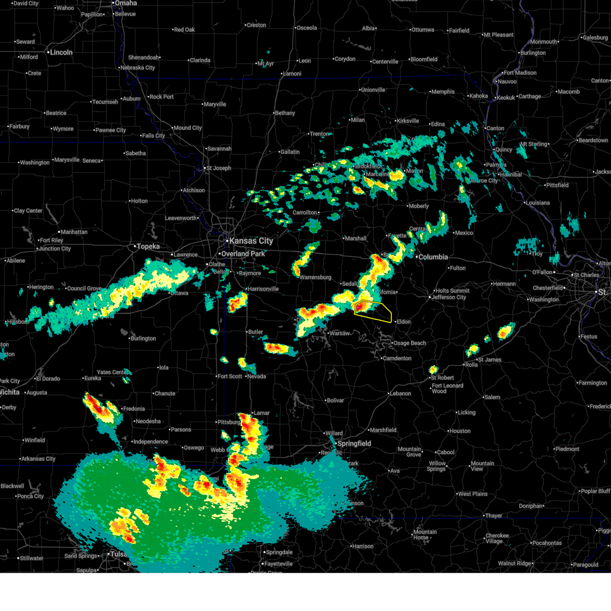 At 935 pm cdt, severe thunderstorms were located along a line extending from eldon to 13 miles southeast of eldon to 7 miles northwest of vienna, and moving south southeast at 25 mph (radar indicated). Hazards include 60 mph wind gusts and quarter size hail. Hail damage to vehicles is expected. expect wind damage to roofs, siding and trees. locations impacted include, eldon, iberia, lake ozark, lakeland, laurie, osage beach, vienna and village of four seasons. this warning also includes lake of the ozarks state park and lake of the ozarks. A tornado watch remains in effect until midnight cdt thursday morning for southeast kansas and southern missouri.