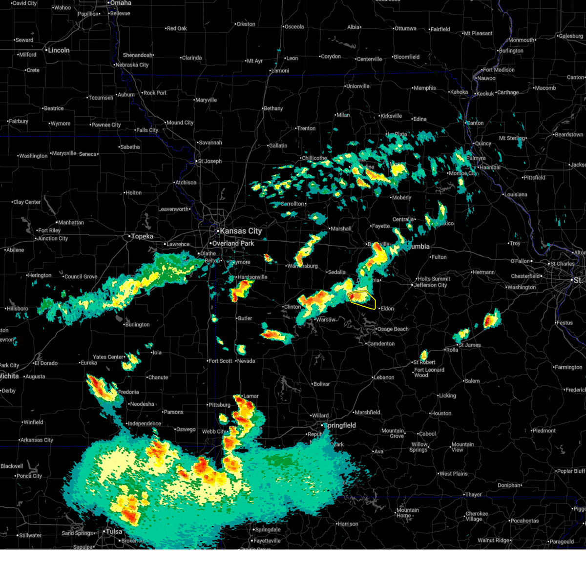 At 1016 pm cdt, severe thunderstorms were located along a line extending from osage beach to 13 miles northwest of macks creek to 9 miles southwest of warsaw, and moving south southeast at 25 mph (radar indicated). Hazards include 60 mph wind gusts and quarter size hail. Hail damage to vehicles is expected. expect wind damage to roofs, siding and trees. locations impacted include, camdenton, hermitage, lake ozark, laurie, macks creek, osage beach, village of four seasons, warsaw and wheatland. this warning also includes ha ha tonka state park, lake of the ozarks state park, lake of the ozarks, truman lake and truman state park. a tornado warning also remains in effect for southwestern benton and northern hickory counties. A tornado watch remains in effect until midnight cdt thursday morning for southeast kansas and southern missouri.