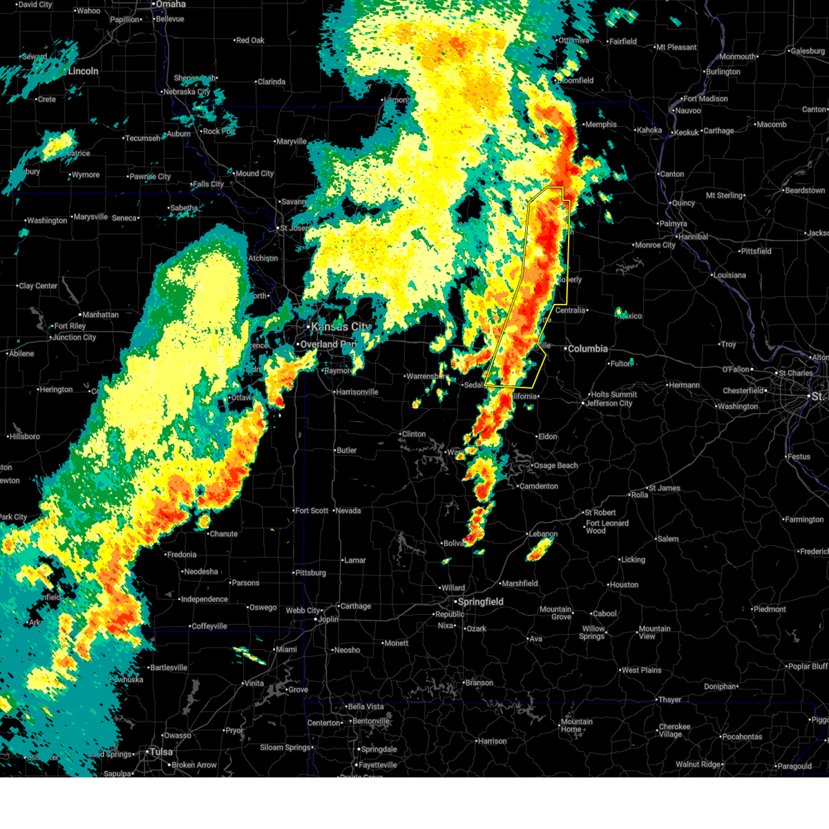 At 1104 am cdt, severe thunderstorms were located along a line extending from 7 miles southwest of huntsville to 7 miles southwest of tipton, moving east at 35 mph (trained weather spotters). Hazards include 60 mph wind gusts and half dollar size hail. Hail damage to vehicles is expected. expect wind damage to roofs, siding, and trees. locations impacted include, sedalia, moberly, boonville, fayette, salisbury, huntsville, glasgow, new franklin, pilot grove, smithton, higbee, otterville, bunceton, clark, cairo, armstrong, rocheport, prairie home, nelson and renick. This includes interstate 70 in missouri between mile markers 84 and 114.