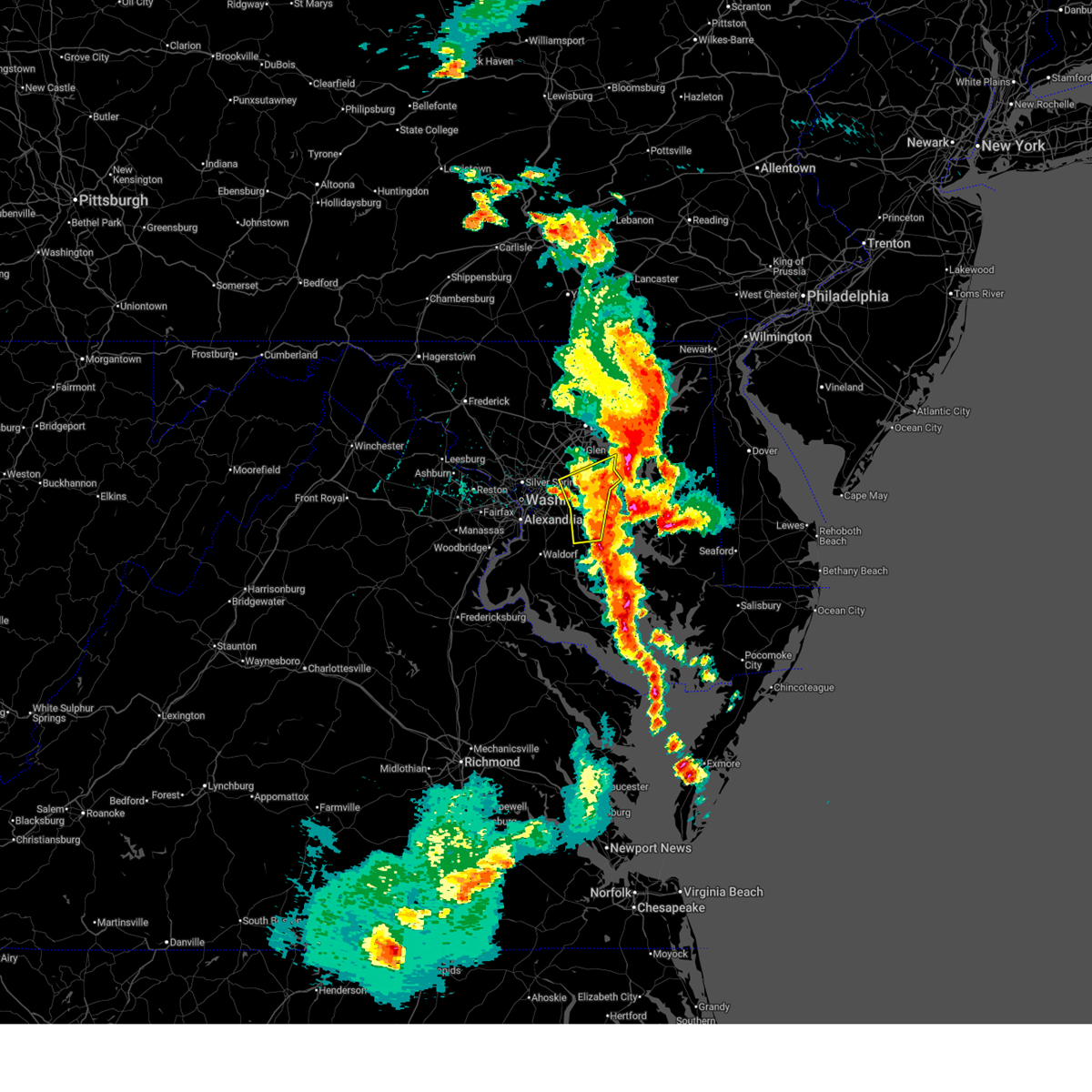 Svrlwx the national weather service in sterling virginia has issued a * severe thunderstorm warning for, the district of columbia, anne arundel county in central maryland, northwestern calvert county in southern maryland, prince georges county in central maryland, north central charles county in southern maryland, arlington county in northern virginia, east central fairfax county in northern virginia, the city of alexandria in northern virginia, * until 630 pm edt. * at 540 pm edt, severe thunderstorms were located along a line extending from gallaudet university to oxon hill to fort washington, moving east at 45 mph (radar indicated). Hazards include 70 mph wind gusts and quarter size hail. Damaging winds will cause some trees and large branches to fall. this could injure those outdoors, as well as damage homes and vehicles. roadways may become blocked by downed trees. localized power outages are possible. Unsecured light objects may become projectiles.