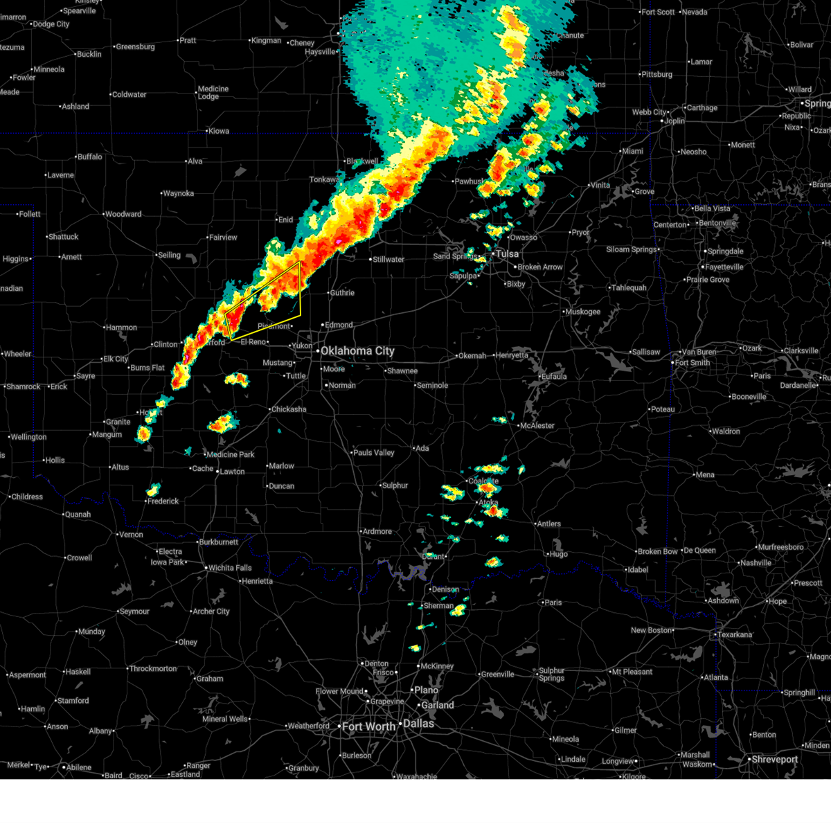 At 913 pm cdt, severe thunderstorms were located along a line extending from 6 miles northeast of greenfield to 4 miles southeast of okarche to 3 miles northwest of yukon to 3 miles south of tuttle, moving northeast at 55 mph (radar indicated). Hazards include 70 mph wind gusts and nickel size hail. Expect considerable tree damage. damage is likely to mobile homes, roofs, and outbuildings. locations impacted include, oklahoma city, western edmond, moore, del city, el reno, guthrie, newcastle, kingfisher, yukon, bethany, mustang, warr acres, the village, tuttle, piedmont, nichols hills, hennessey, union city, minco and crescent. this includes the following highways, interstate 35 between mile markers 118 and 137. interstate 40 between mile markers 113 and 155. interstate 44 between mile markers 108 and 130. Interstate 240 between mile markers 1 and 8.