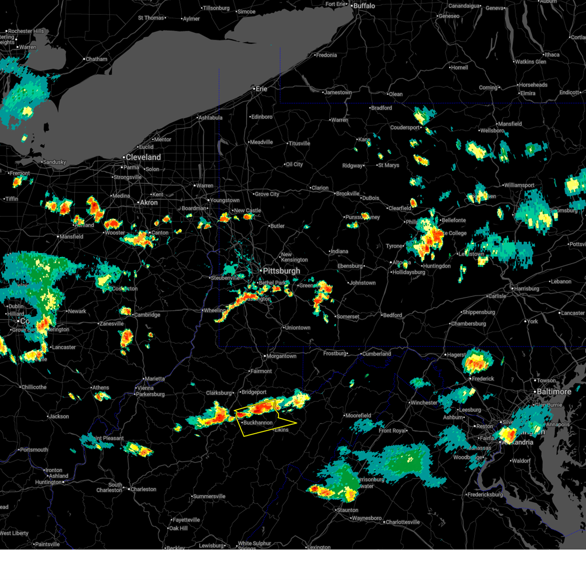 At 1224 pm edt, severe thunderstorms were located along a line extending from near buckhannon to near holly river state park to 10 miles east of addison (webster springs) to near leonard, moving east at 70 mph (radar indicated). Hazards include 70 mph wind gusts. Expect considerable tree damage. damage is likely to mobile homes, roofs, and outbuildings. Locations impacted include, elkins, buckhannon, philippi, marlinton, cass scenic railroad, audra state park, greenbank, belington, mill creek, snowshoe, dailey, holly river state park, mingo, beverly, junior, durbin, hillsboro, womelsdorf (coalton), huttonsville, and montrose.