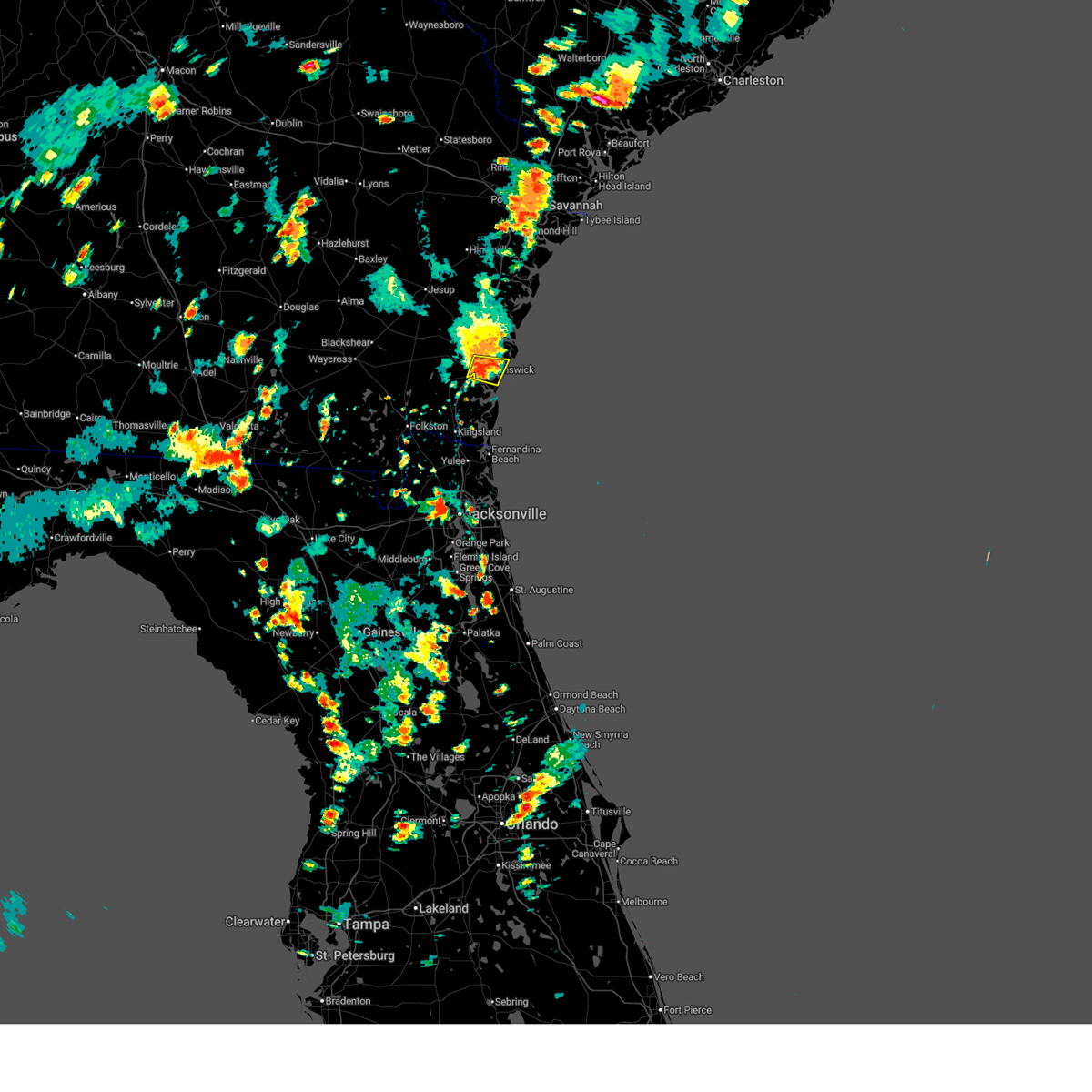 At 614 pm est, severe thunderstorms were located along a line extending from near waynesville to 6 miles north of st. george, moving northeast at 85 mph (radar indicated). Hazards include 60 mph wind gusts and quarter size hail. Hail damage to vehicles is expected. expect wind damage to roofs, siding, and trees. locations impacted include, st. marys, kingsland, brunswick, st. simons island, hilliard, folkston, woodbine, callahan, dock junction and kings bay base. A tornado watch remains in effect until 800 pm est for northern and northeastern florida, and southeastern georgia.