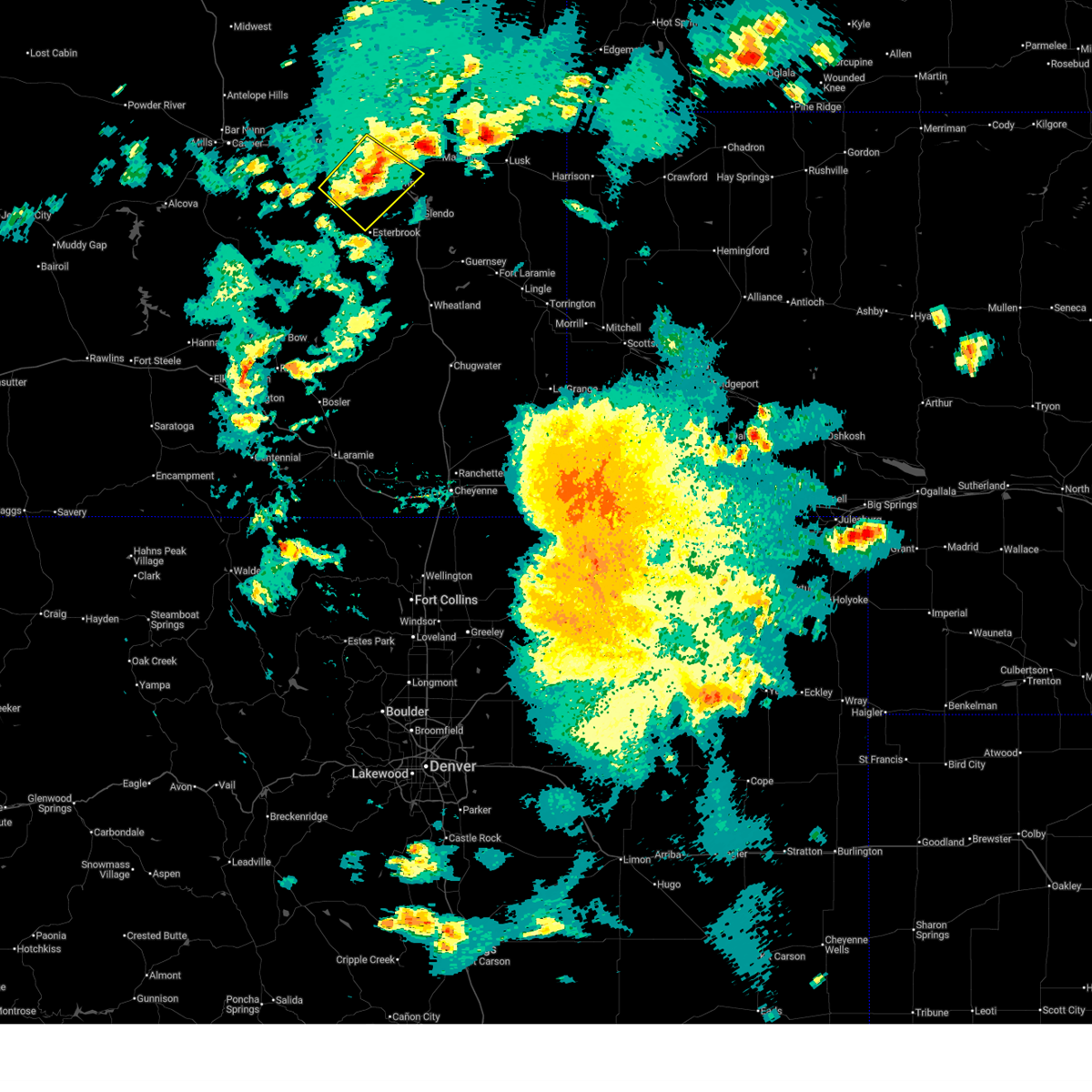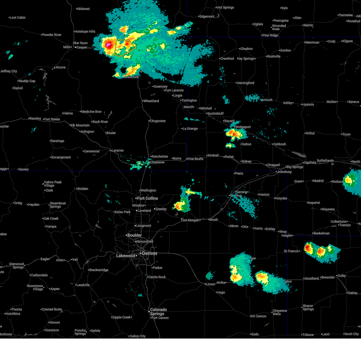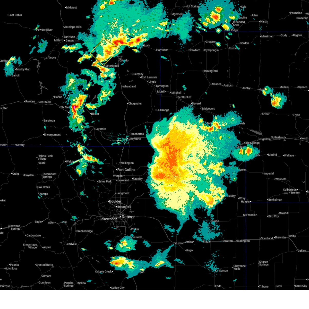 At 717 pm mdt, severe thunderstorms were located along a line extending from 9 miles east of teapot rock to 8 miles northeast of rolling hills to near douglas, moving northeast at 30 mph. these are destructive storms for converse county including douglas, glenrock, deer creek, and bill! (trained weather spotters. wind gusts to 82 mph have been confirmed by automated weather observations along interstate 25 near deer creek!). Hazards include 80 mph wind gusts and quarter size hail. Flying debris will be dangerous to those caught without shelter. mobile homes will be heavily damaged. expect considerable damage to roofs, windows, and vehicles. extensive tree damage and power outages are likely. locations impacted include, douglas, glenrock, rolling hills, rolling hills estates, laprele reservoir, deer creek, boxelder, bill, dull center and manning ranch. this includes interstate 25 in wyoming between mile markers 133 and 175. thunderstorm damage threat, destructive hail threat, radar indicated max hail size, 1. 00 in wind threat, radar indicated max wind gust, 80 mph.