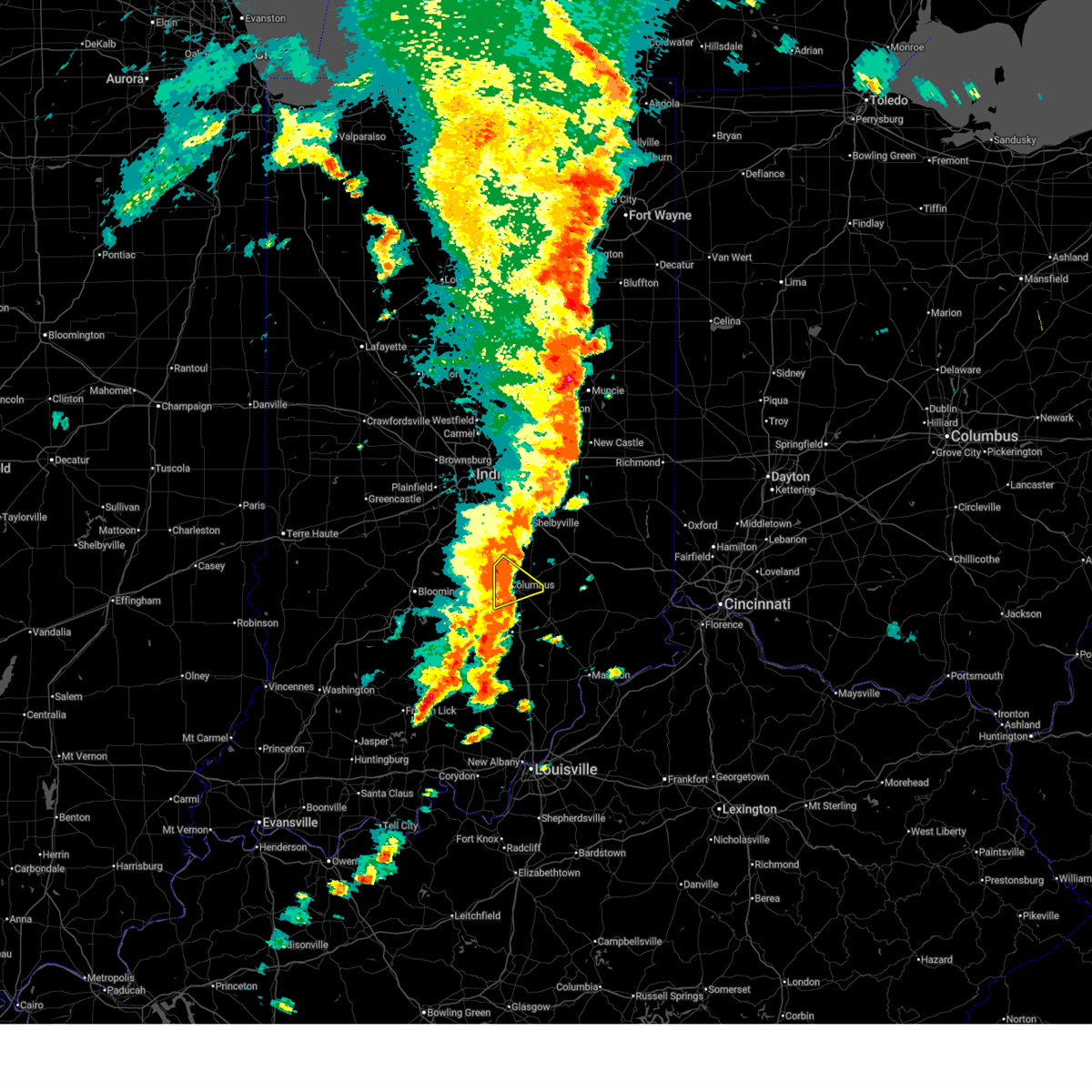 At 1138 pm edt, severe thunderstorms were located along a line extending from 6 miles east of columbus to 8 miles north of scottsburg, moving east at 55 mph (radar indicated). Hazards include 70 mph wind gusts and penny size hail. Expect considerable tree damage. damage is likely to mobile homes, roofs, and outbuildings. locations impacted include, north vernon, greensburg, newbern, paris crossing, hartsville, crothersville, nebraska, azalia, millhousen, cortland, country squire lakes, elizabethtown, seymour, westport, hayden, letts, burney, milford, clifford, and butlerville. this includes the following highways, interstate 65 between mile markers 37 and 74. Interstate 74 between mile markers 132 and 144.