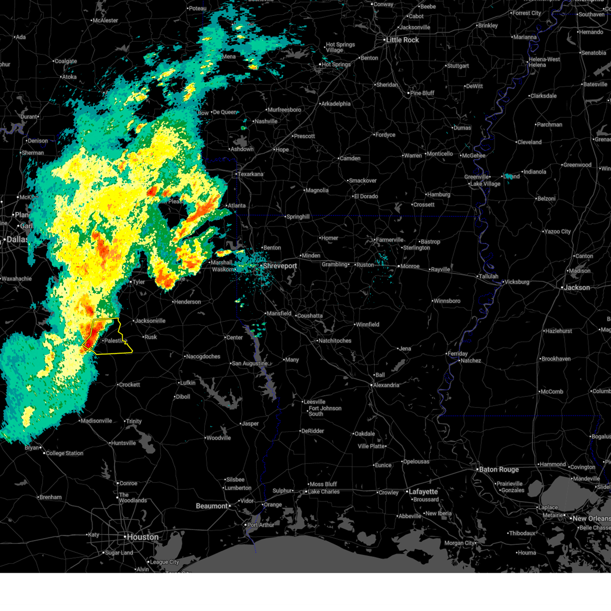 At 1253 am cdt, a severe thunderstorm was located near elkhart, or 9 miles south of palestine, moving northeast at 20 mph (radar indicated). Hazards include 60 mph wind gusts and quarter size hail. Hail damage to vehicles is expected. expect wind damage to roofs, siding, and trees. this severe storm will be near, elkhart around 105 am cdt. palestine around 120 am cdt. Other locations impacted by this severe thunderstorm include oakwood.