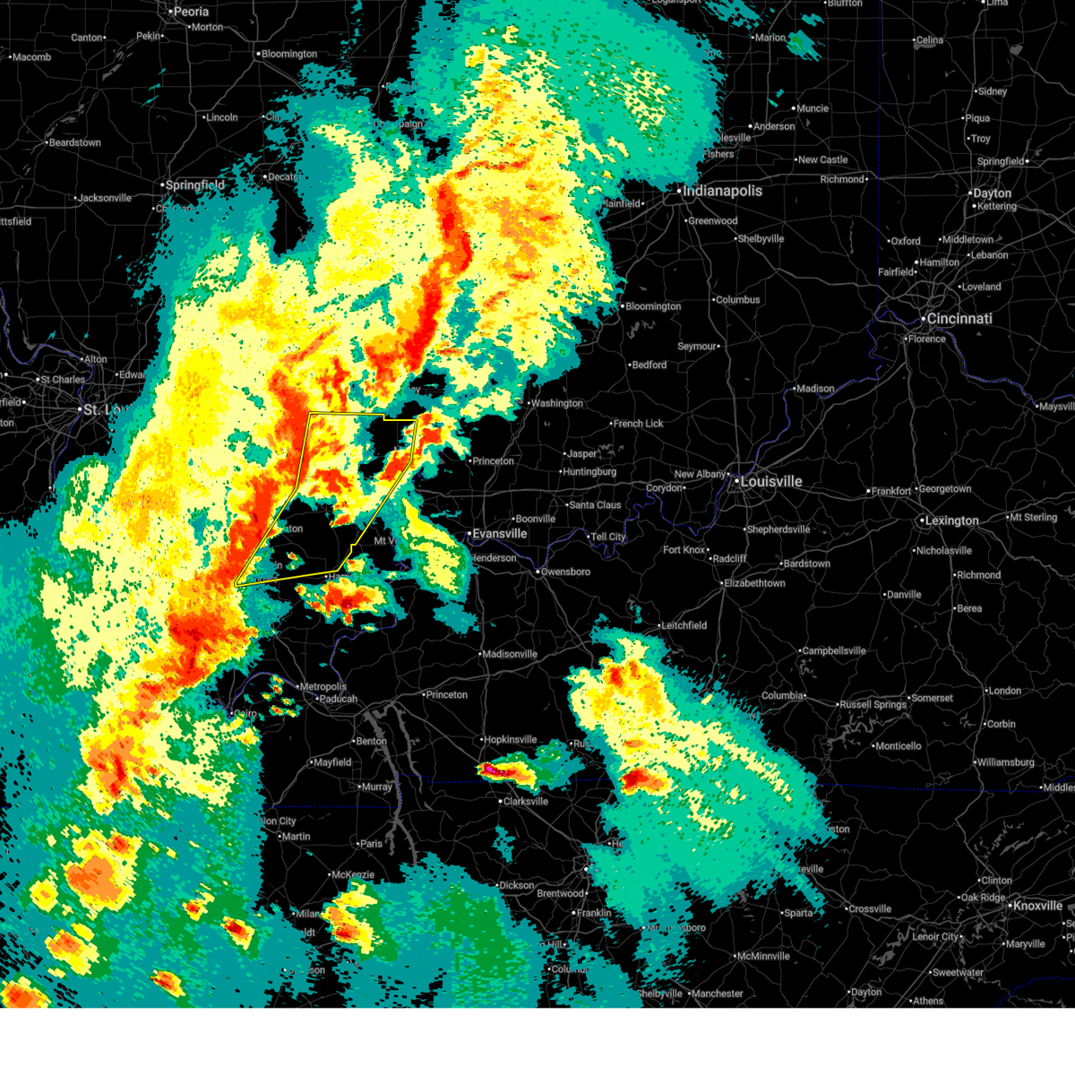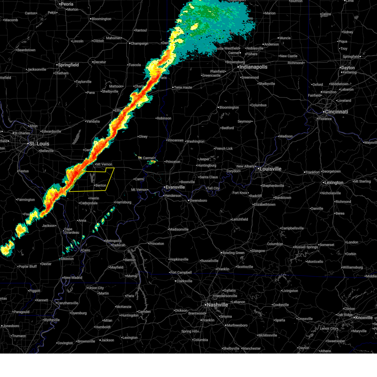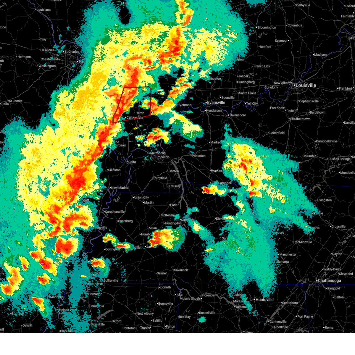 Torpah the national weather service in paducah has issued a * tornado warning for, perry county in south central illinois, southern jefferson county in south central illinois, northern williamson county in southern illinois, jackson county in southern illinois, franklin county in south central illinois, * until 715 pm cdt. * at 628 pm cdt, severe thunderstorms capable of producing both tornadoes and extensive straight line wind damage were located along a line extending from near st. mary to 8 miles east of perryville to 6 miles southwest of altenburg, moving east at 85 mph (radar indicated rotation). Hazards include tornado. Flying debris will be dangerous to those caught without shelter. mobile homes will be damaged or destroyed. damage to roofs, windows, and vehicles will occur. tree damage is likely. these dangerous storms will be near, grand tower around 635 pm cdt. willisville, ava, murphysboro, and carbondale around 640 pm cdt. de soto around 645 pm cdt. royalton, energy, elkville, hurst, crainville, herrin, cambria, carterville, and du quoin around 650 pm cdt. johnston city, west frankfort, marion, christopher, and zeigler around 655 pm cdt. benton, west city, sesser, valier, rend lake area, and pittsburg around 700 pm cdt. thompsonville around 705 pm cdt. other locations impacted by these tornadic storms include whiteash, orient, spillertown, dowell, bonnie, north city, nason, buckner, hanaford, and campbell hill. This includes interstate 57 in illinois between mile markers 53 and 87.