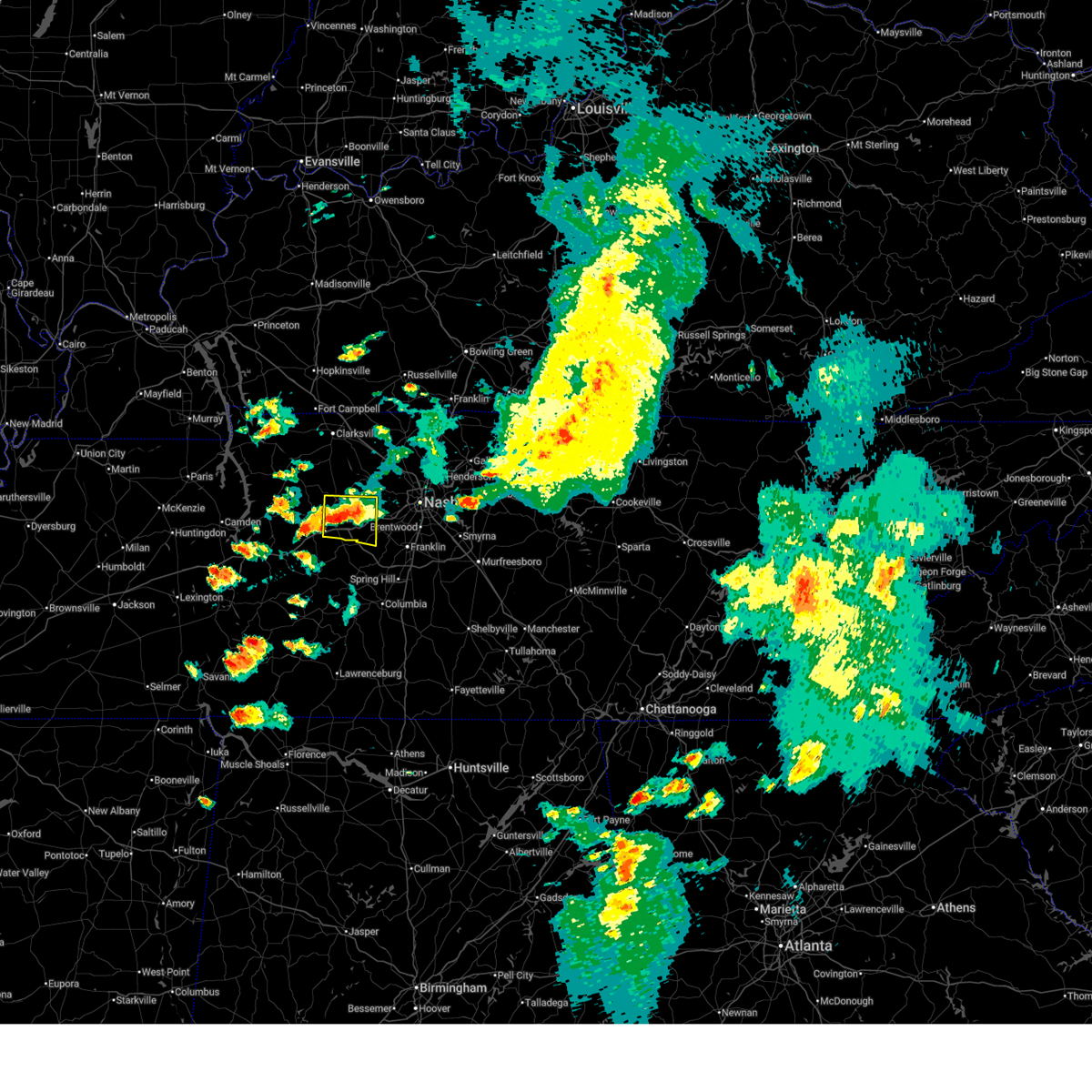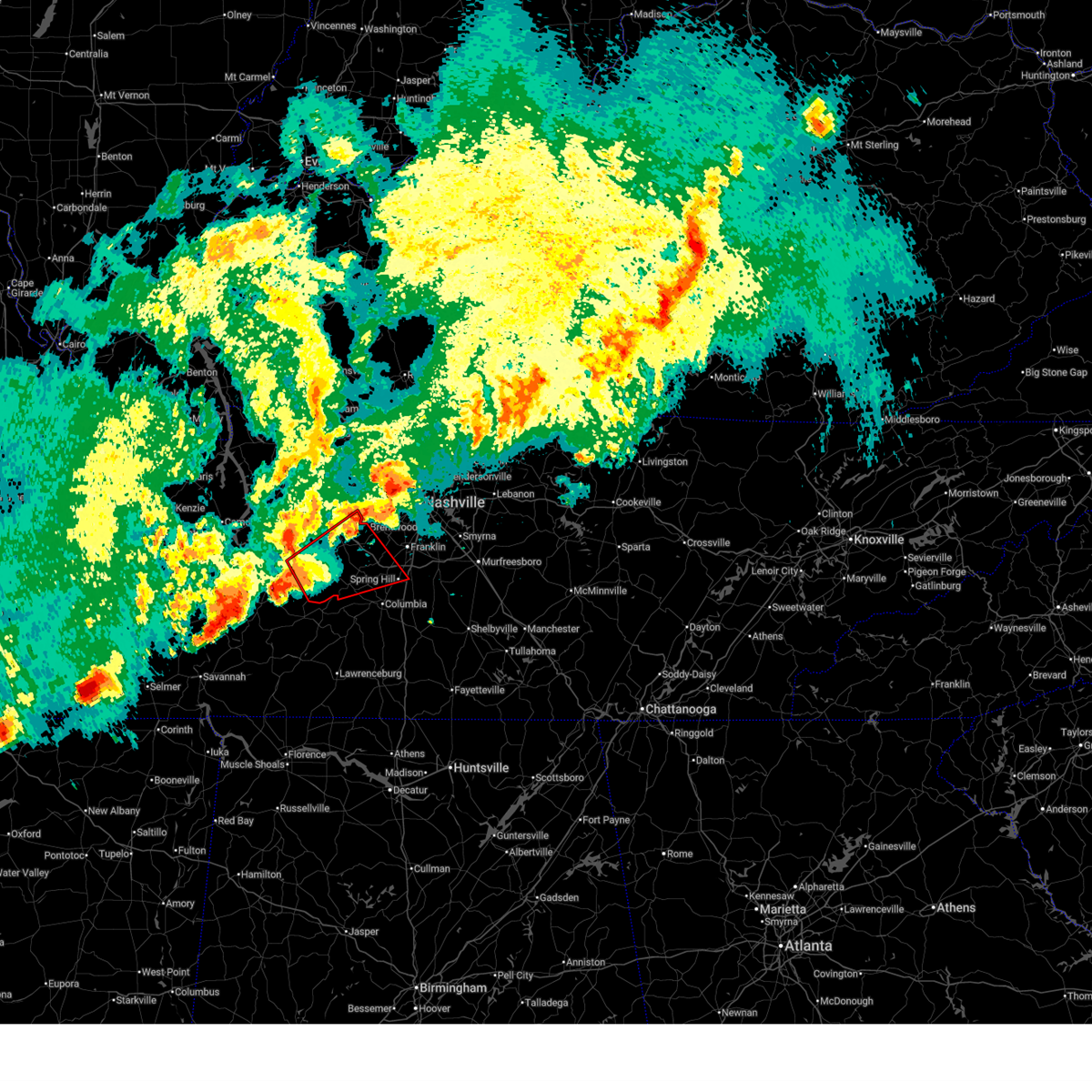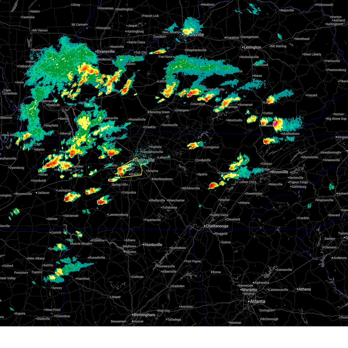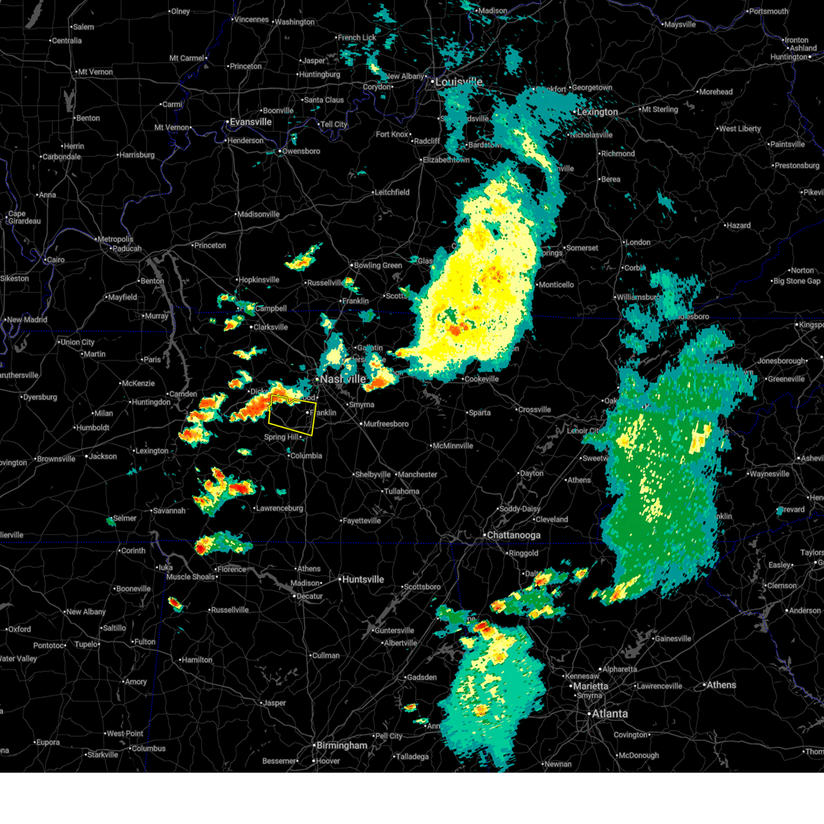 At 707 pm cst, a severe thunderstorm capable of producing a tornado was located near fairview, or 12 miles west of franklin, moving northeast at 40 mph (radar indicated rotation). Hazards include tornado. Flying debris will be dangerous to those caught without shelter. mobile homes will be damaged or destroyed. damage to roofs, windows and vehicles will occur. tree damage is likely. this dangerous storm will be near, bellevue around 720 pm cst. brentwood around 725 pm cst. forest hills and belle meade around 730 pm cst. oak hill around 735 pm cst. Other locations impacted by this tornadic thunderstorm include natchez trace at highway 96, bells bend and berry hill.
