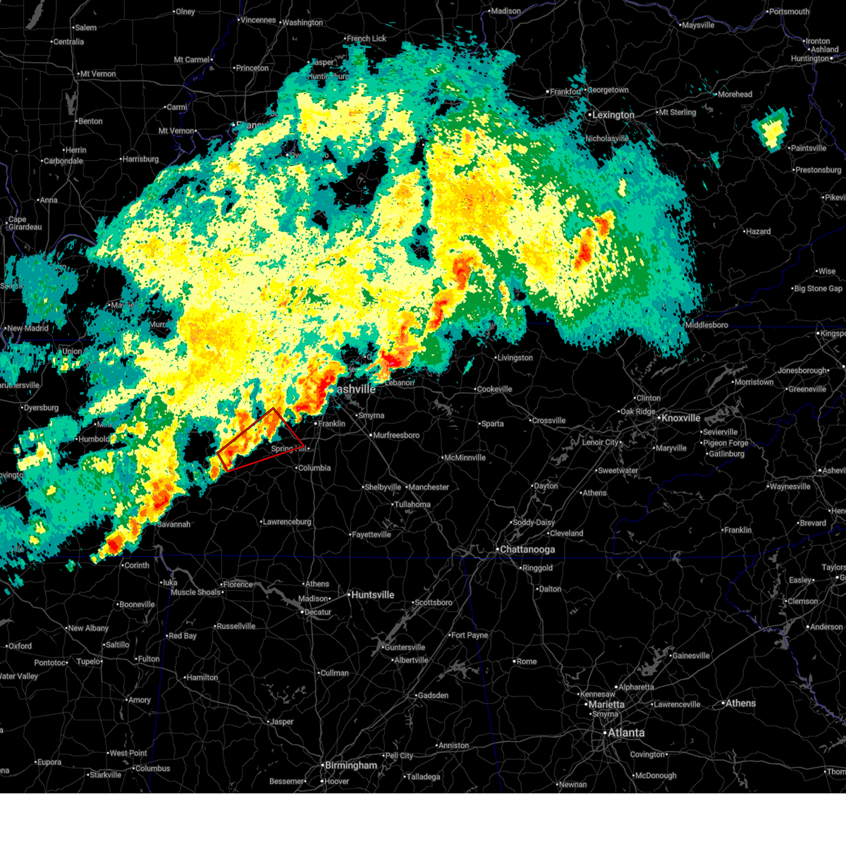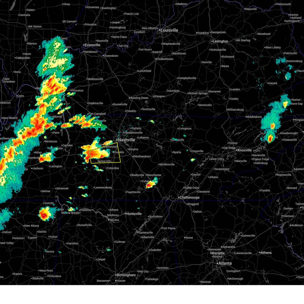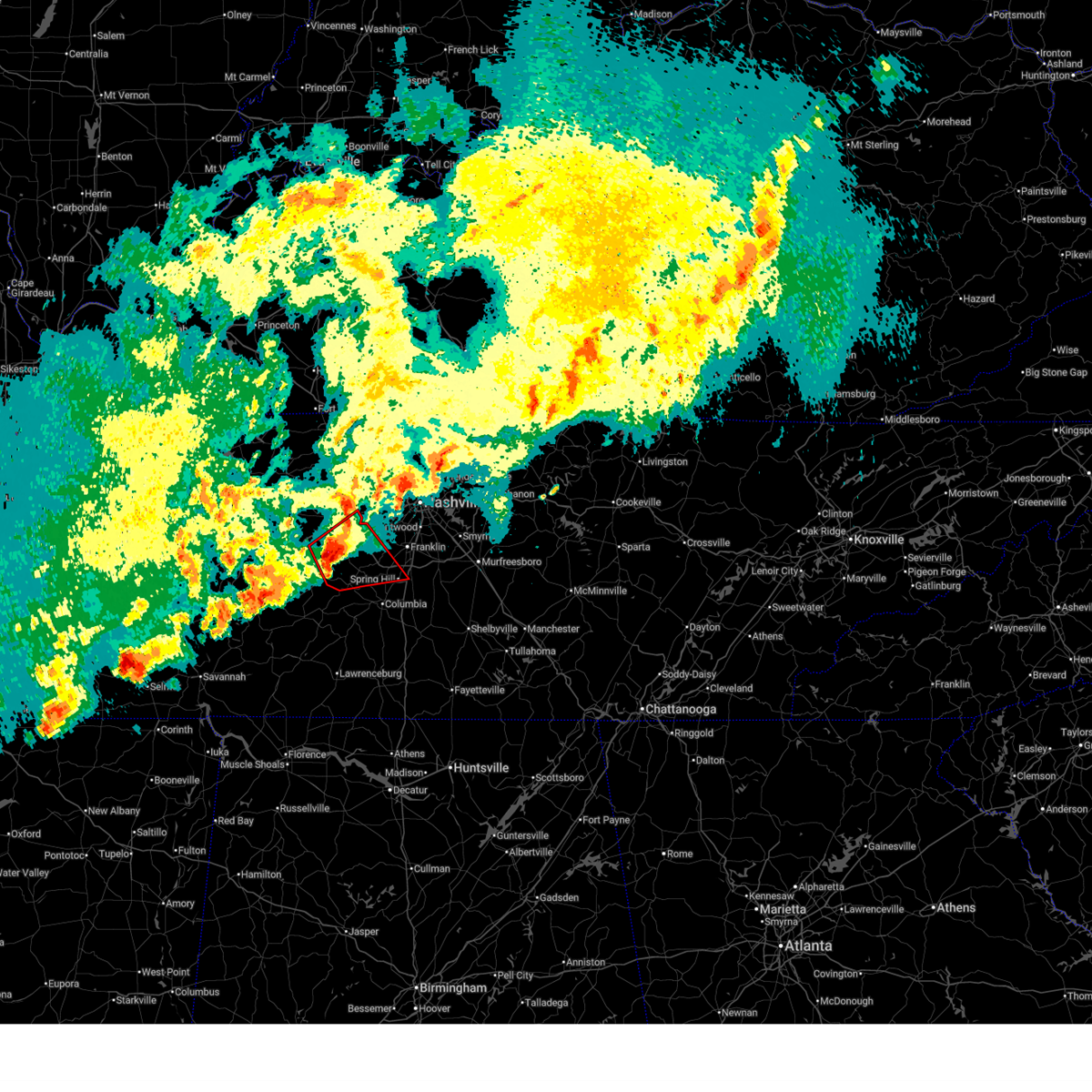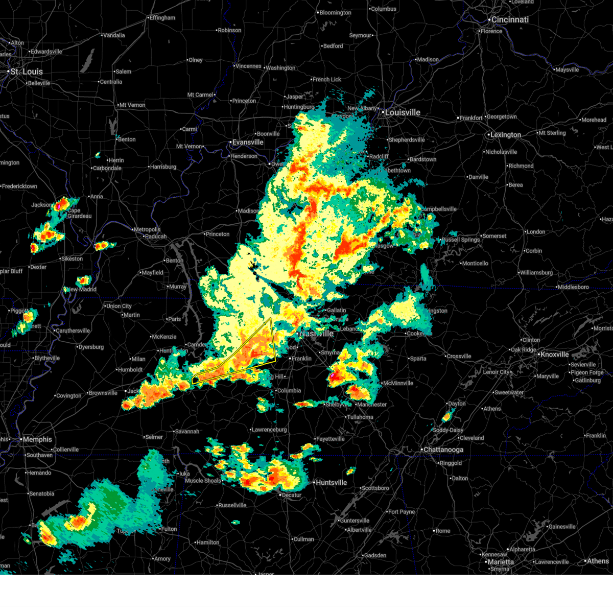 At 707 pm cst, a severe thunderstorm capable of producing a tornado was located near fairview, or 12 miles west of franklin, moving northeast at 40 mph (radar indicated rotation). Hazards include tornado. Flying debris will be dangerous to those caught without shelter. mobile homes will be damaged or destroyed. damage to roofs, windows and vehicles will occur. tree damage is likely. this dangerous storm will be near, bellevue around 720 pm cst. brentwood around 725 pm cst. forest hills and belle meade around 730 pm cst. oak hill around 735 pm cst. Other locations impacted by this tornadic thunderstorm include natchez trace at highway 96, bells bend and berry hill.