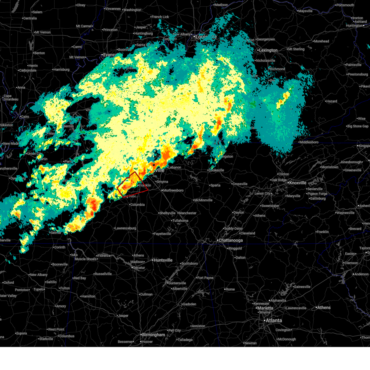 At 710 pm cst, a severe thunderstorm capable of producing a tornado was located over fairview, or 9 miles west of franklin, moving northeast at 65 mph (radar indicated rotation). Hazards include tornado. Flying debris will be dangerous to those caught without shelter. mobile homes will be damaged or destroyed. damage to roofs, windows and vehicles will occur. tree damage is likely. this dangerous storm will be near, franklin around 720 pm cst. Other locations impacted by this tornadic thunderstorm include natchez trace at highway 96.
