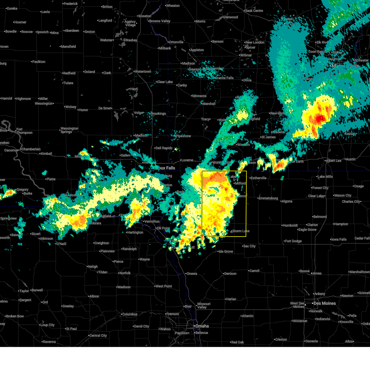 Svrfsd the national weather service in sioux falls has issued a * severe thunderstorm warning for, northwestern cherokee county in northwestern iowa, eastern lyon county in northwestern iowa, osceola county in northwestern iowa, dickinson county in northwestern iowa, sioux county in northwestern iowa, plymouth county in northwestern iowa, northwestern clay county in northwestern iowa, o'brien county in northwestern iowa, southern jackson county in southwestern minnesota, southern nobles county in southwestern minnesota, * until 200 am cdt. * at 114 am cdt, severe thunderstorms were located along a line extending from near rushmore to near elk point, moving southeast at 25 mph (radar indicated). Hazards include 60 mph wind gusts and quarter size hail. Hail damage to vehicles is expected. expect wind damage to roofs, siding, and trees. severe thunderstorms will be near, sioux center, hull, akron, george, ireton, and little rock around 120 am cdt. sibley, boyden, craig, and matlock around 125 am cdt. ashton and maurice around 130 am cdt. Other locations in the path of these severe thunderstorms include orange city, sheldon, struble, alton, le mars, merrill and hospers.