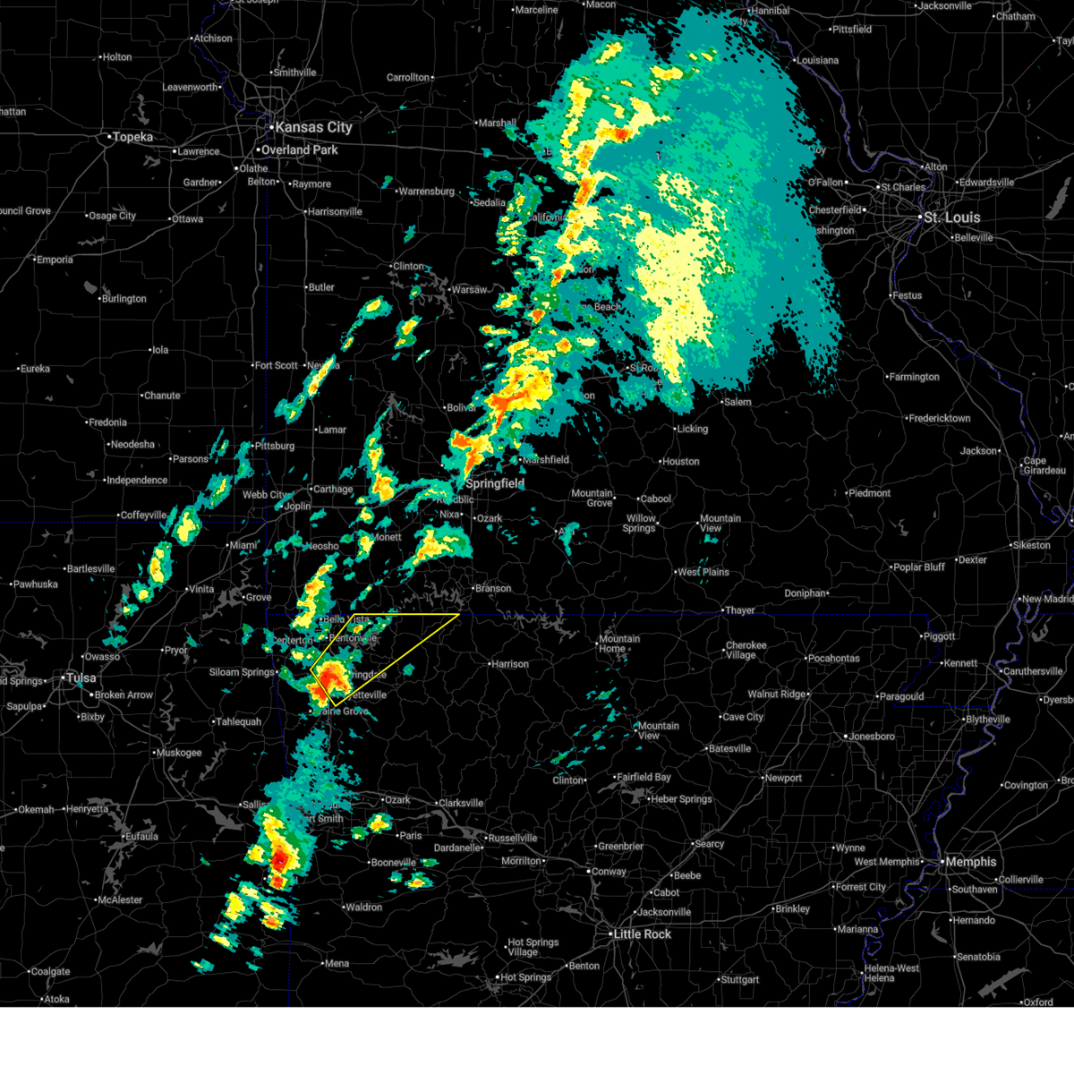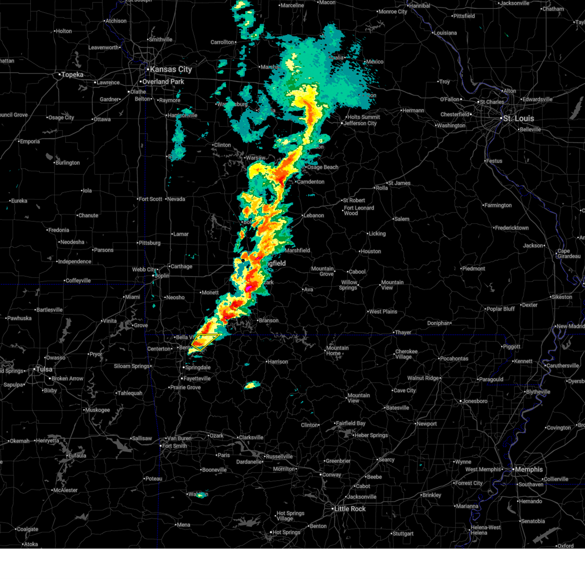 At 1240 am cdt, a severe thunderstorm capable of producing a tornado was located 3 miles southwest of bella vista, moving east at 50 mph (radar indicated rotation). Hazards include tornado. Flying debris will be dangerous to those caught without shelter. mobile homes will be damaged or destroyed. damage to roofs, windows, and vehicles will occur. tree damage is likely. Locations in or near the path include, rogers, bentonville, bella vista, lowell, pea ridge, highfill, garfield, gateway, hiwasse, miller, centerton, avoca, larue, bland, walnut hill, hill top, vaughn, this includes interstate 49 between mile markers 81 and 84, and between mile markers 86 and 93.