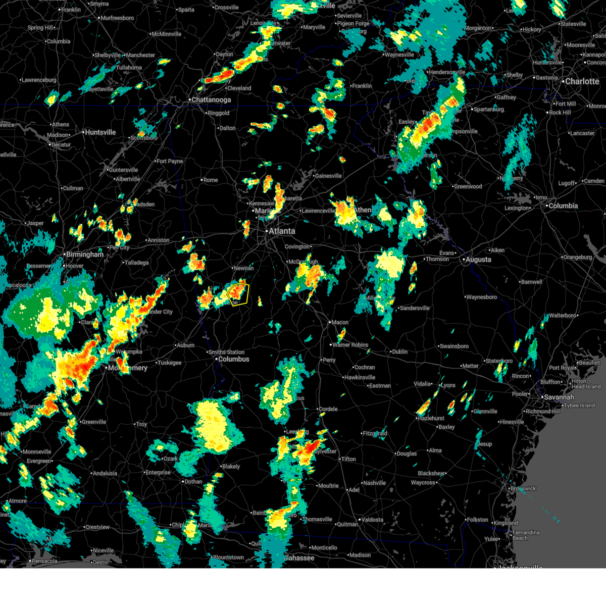 At 322 pm edt, severe thunderstorms were located along a line extending from near turin to near greenville, moving northeast at 40 mph (radar indicated). Hazards include 60 mph wind gusts. Expect damage to roofs, siding, and trees. Locations impacted include, rocky mount, saint marks, brooks, greenville, luthersville, haralson, hollonville, senoia, alvaton, lone oak, digbey, gay, wooster, and turin.