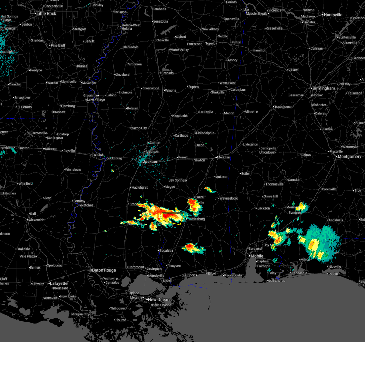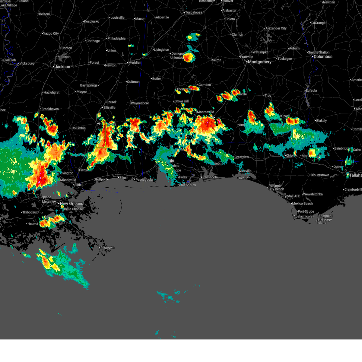 At 646 am cdt, a confirmed large and extremely dangerous tornado was located 7 miles northeast of pine burr, or 11 miles west of purvis, moving east at 35 mph. this is a particularly dangerous situation. take cover now! (radar confirmed tornado). Hazards include damaging tornado. You are in a life-threatening situation. flying debris may be deadly to those caught without shelter. mobile homes will be destroyed. considerable damage to homes, businesses, and vehicles is likely and complete destruction is possible. the tornado will be near, hattiesburg and pine ridge around 650 am cdt. oak grove around 655 am cdt. west hattiesburg around 700 am cdt. sunrise and petal around 715 am cdt. macedonia around 725 am cdt. Other locations impacted by this tornadic thunderstorm include corinth.