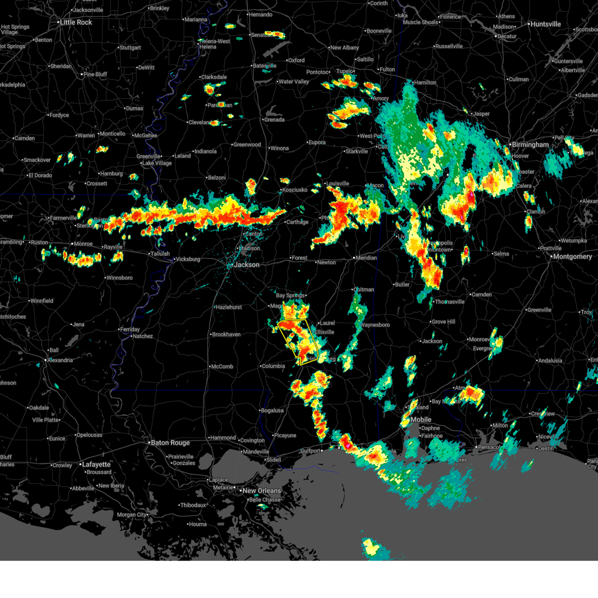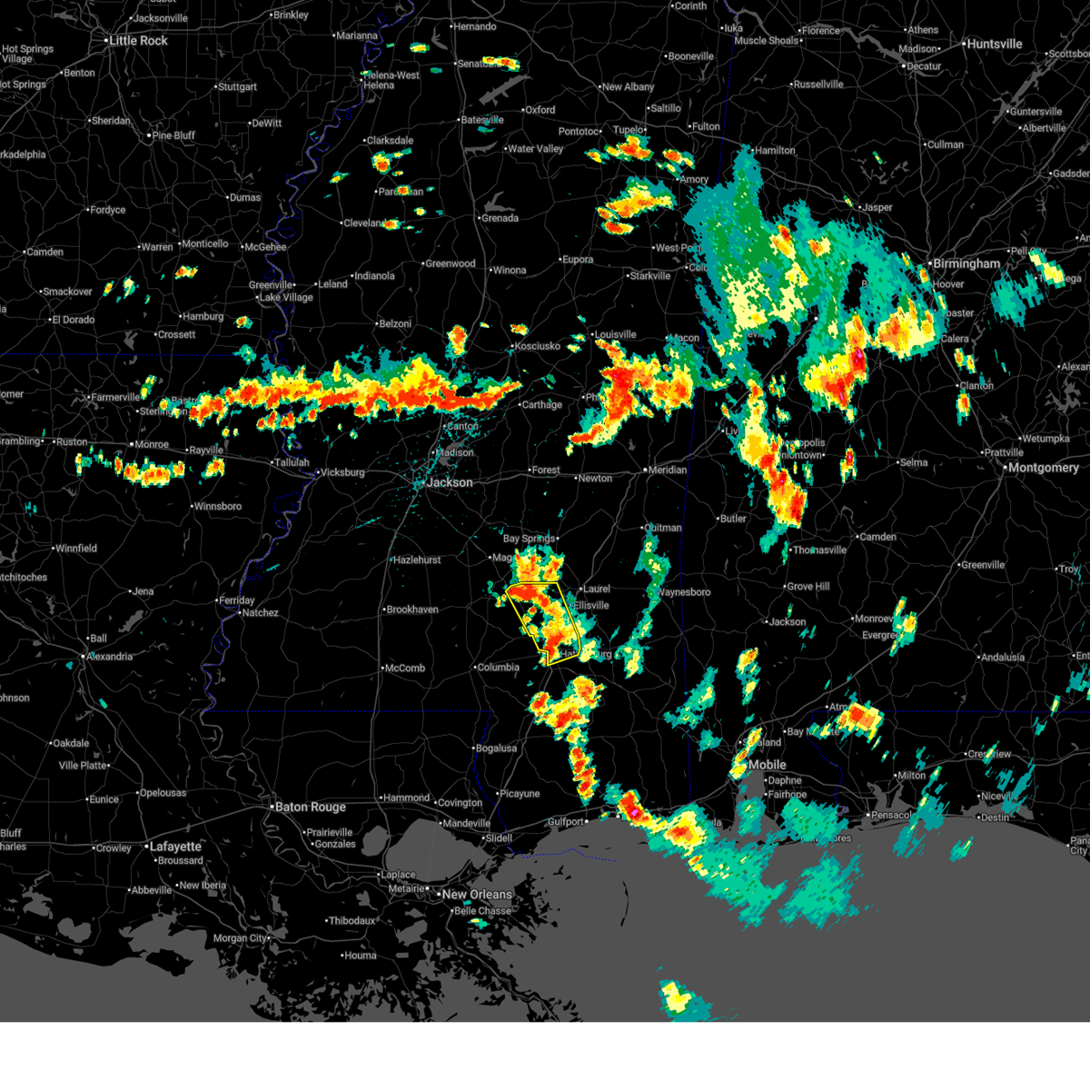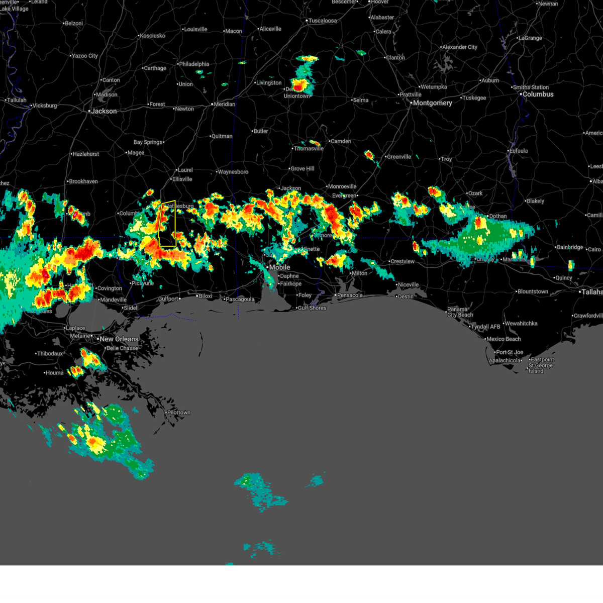 At 632 am cdt, a severe thunderstorm capable of producing a tornado was located over pine burr, or 9 miles southeast of columbia, moving east at 25 mph (radar indicated rotation). Hazards include tornado and quarter size hail. Flying debris will be dangerous to those caught without shelter. mobile homes will be damaged or destroyed. damage to roofs, windows, and vehicles will occur. tree damage is likely. this dangerous storm will be near, pine burr around 635 am cdt. pine ridge around 650 am cdt. hattiesburg around 655 am cdt. oak grove around 700 am cdt. west hattiesburg around 710 am cdt. sunrise and petal around 725 am cdt. Other locations impacted by this tornadic thunderstorm include corinth.