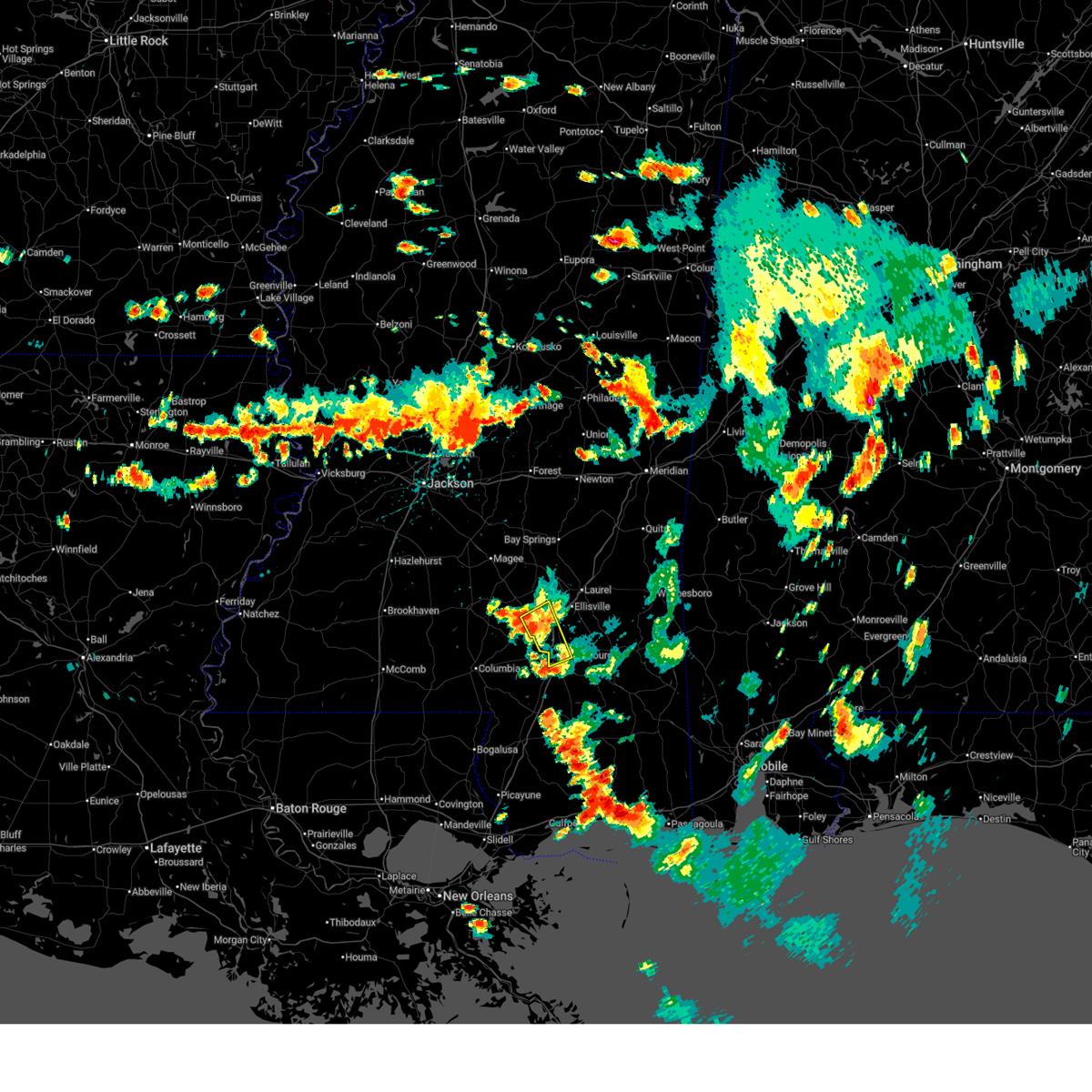 At 1151 pm cdt, a severe thunderstorm was located over ellisville, moving northeast at 40 mph (radar indicated). Hazards include 60 mph wind gusts. Expect damage to roofs, siding, and trees. This severe storm will be near, laurel around 1155 pm cdt.
