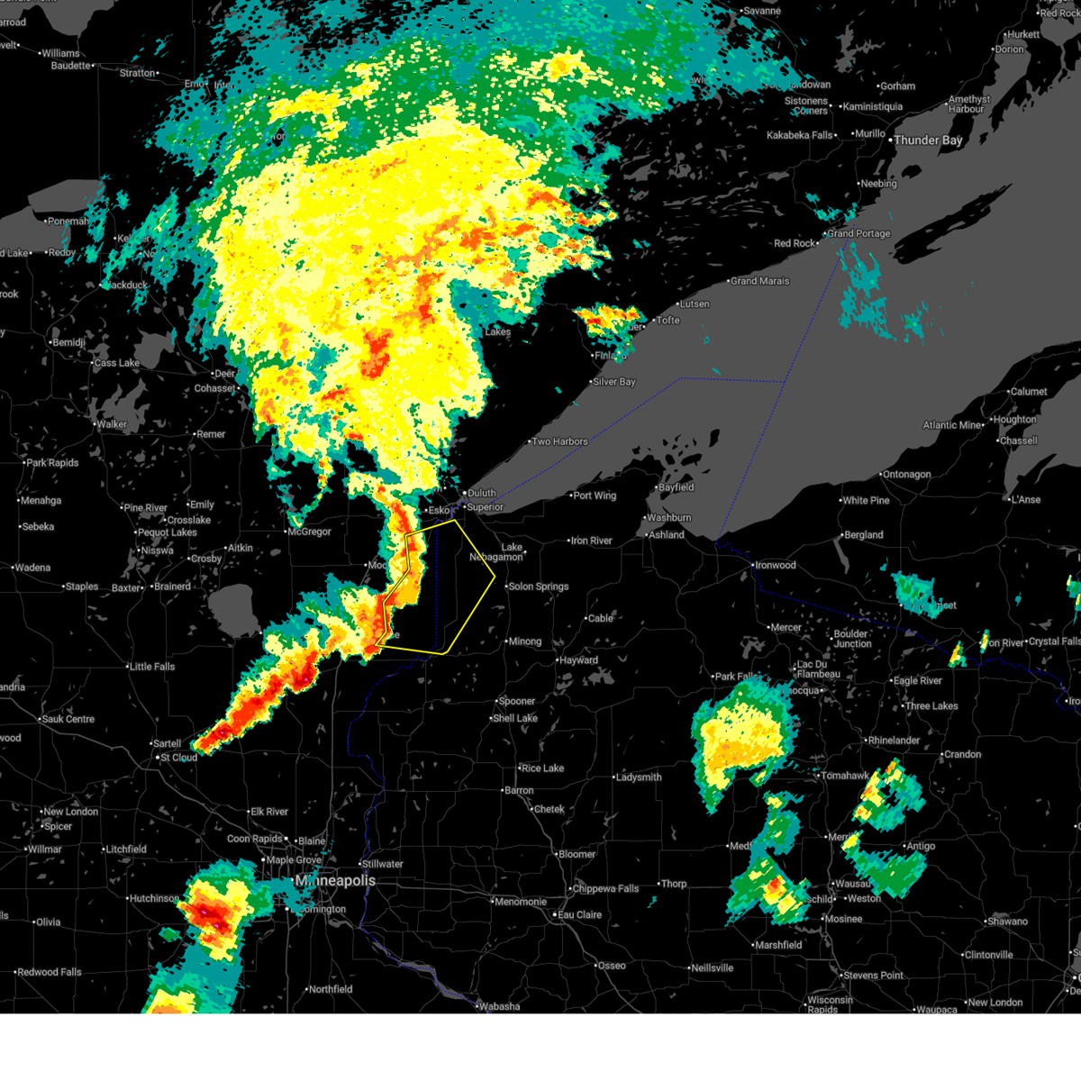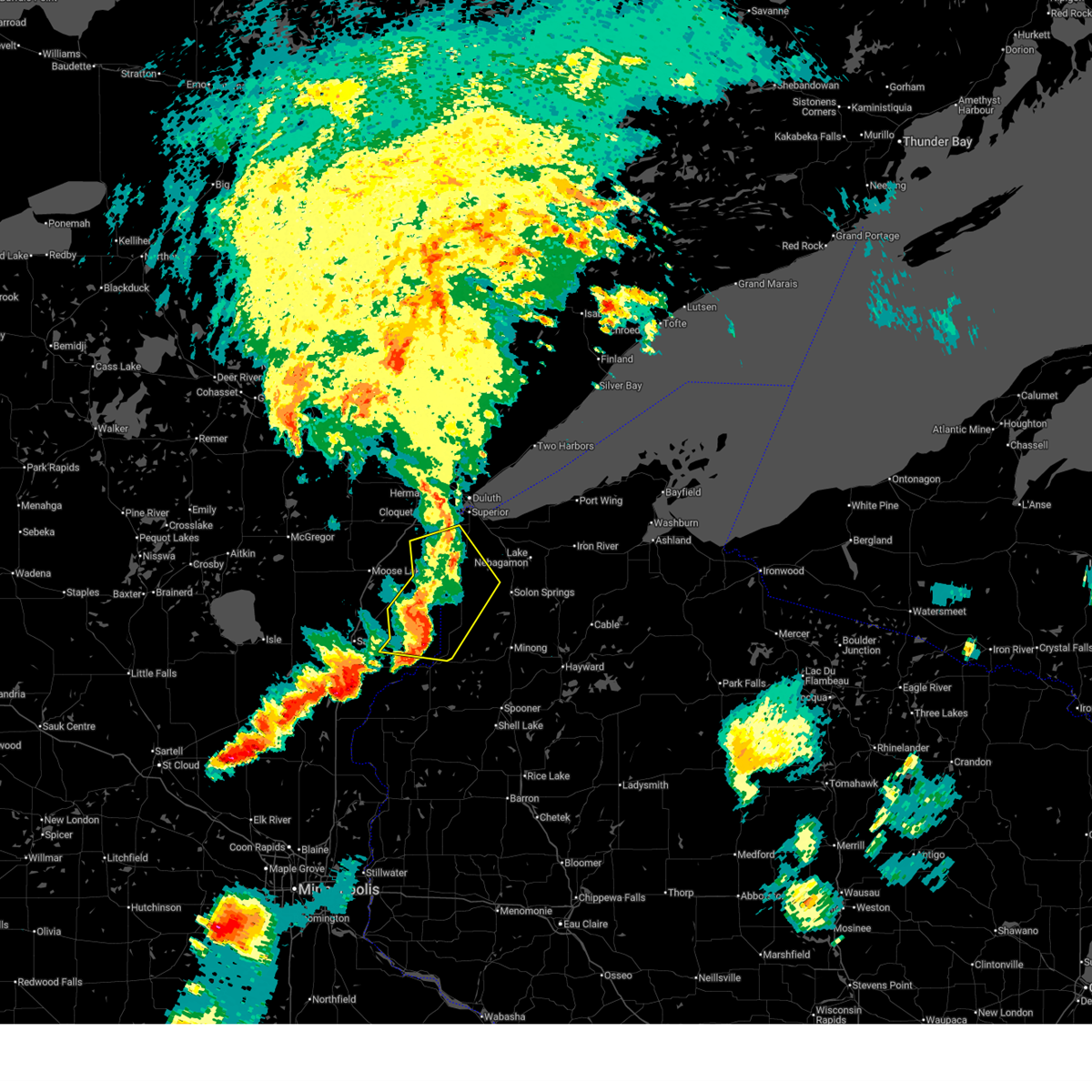 At 823 pm cdt, severe thunderstorms were located along a line extending from 6 miles north of mahtowa to near bruno, moving east at 55 mph (radar indicated). Hazards include 70 mph wind gusts and ping pong ball size hail. People and animals outdoors will be injured. expect hail damage to roofs, siding, windows, and vehicles. expect considerable tree damage. wind damage is also likely to mobile homes, roofs, and outbuildings. severe thunderstorms will be near, carlton, wrenshall and thomson around 835 pm cdt. oliver and dairyland around 845 pm cdt. superior around 850 pm cdt. south range and wisconsin point around 855 pm cdt. hawthorne around 900 pm cdt. maple, poplar in douglas county and gordon around 905 pm cdt. lake nebagamon around 910 pm cdt. Other locations impacted by these severe thunderstorms include pattison state park, lyman lake, scotts corner, wentworth, nickerson, pleasant valley, belden, patzau, chaffey and kingsdale.
