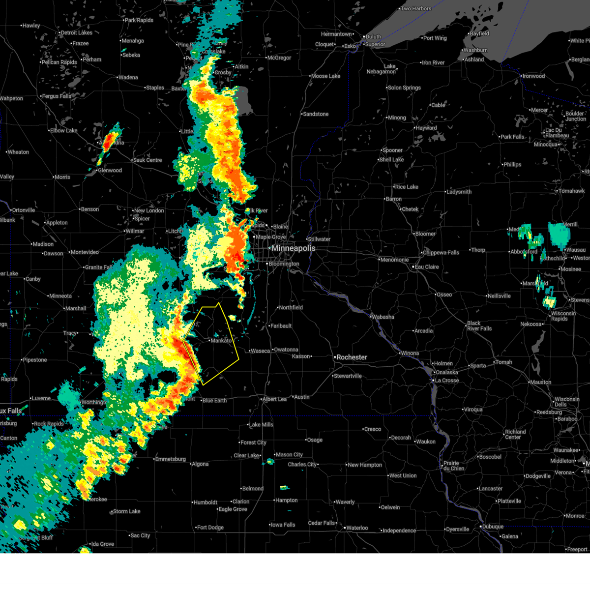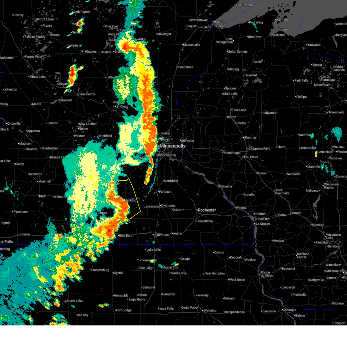At 720 pm cdt, a severe thunderstorm was located near lake crystal, or 8 miles west of mankato, moving northeast at 50 mph. this is a destructive storm for mankato and surrounding towns (radar indicated). Hazards include 80 mph wind gusts. Flying debris will be dangerous to those caught without shelter. mobile homes will be heavily damaged. expect considerable damage to roofs, windows, and vehicles. extensive tree damage and power outages are likely. this severe thunderstorm will be near, mankato around 725 pm cdt. st. peter, eagle lake and kasota around 735 pm cdt. madison lake around 740 pm cdt. Other locations in the path of this severe thunderstorm include cleveland.