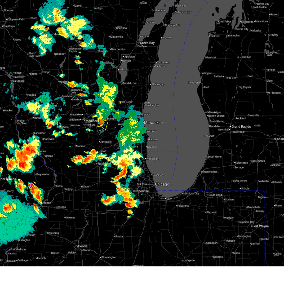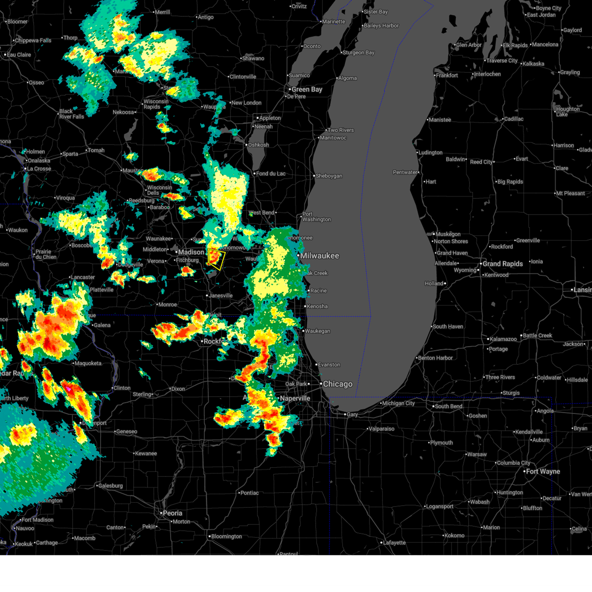 At 910 pm cdt, severe thunderstorms were located along a line extending from near oakfield to near watertown, moving northeast at 90 mph (radar indicated). Hazards include 60 mph wind gusts. Expect damage to roofs, siding, and trees. locations impacted include, madison, sun prairie, fitchburg, watertown, whitewater, stoughton, fort atkinson, oregon, jefferson, mcfarland, monona, lake mills, edgerton, marshall, waterloo, cottage grove, johnson creek, deerfield, palmyra, and shorewood hills. People attending bratfest in madison should seek safe shelter immediately!.