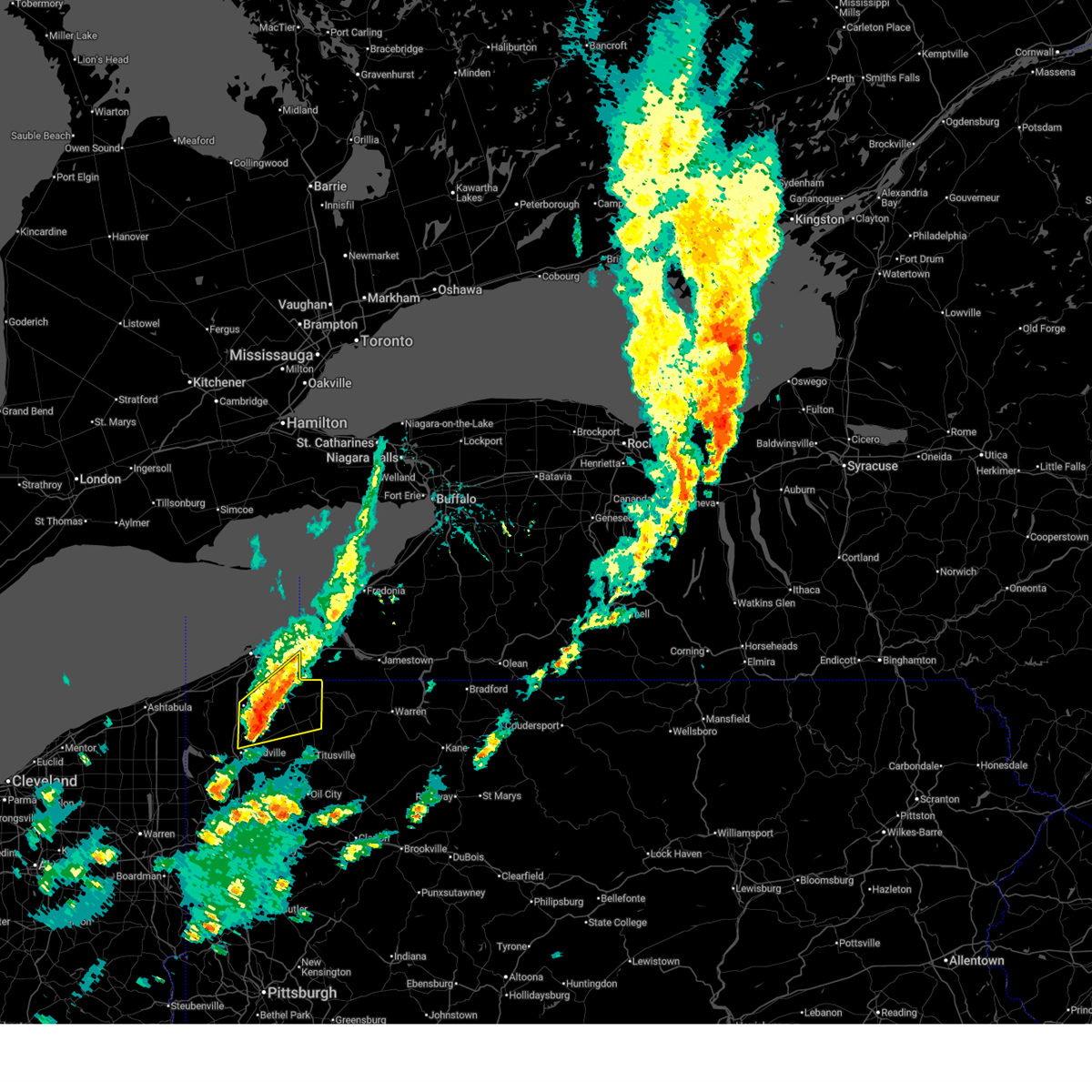 At 128 pm edt, severe thunderstorms were located along a line extending from near north kingsville to andover to sharon, moving northeast at 60 mph (radar indicated. at 118 pm edt, a 63 mph wind gust was reported at youngstown-warren airport. at 119 pm edt, a 55 mph wind gust was reported at ashtabula county airport). Hazards include 70 mph wind gusts. Expect considerable tree damage. damage is likely to mobile homes, roofs, and outbuildings. Locations impacted include, erie, meadville, corry, edinboro, titusville, north east, union city, girard, cambridge springs, waterford, albion, linesville, wattsburg, adamsville, pymatuning central, riceville, harmonsburg, guys mills, pymatuning north, and atlantic.