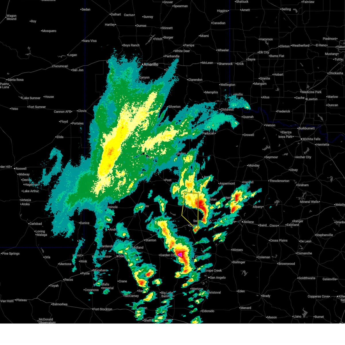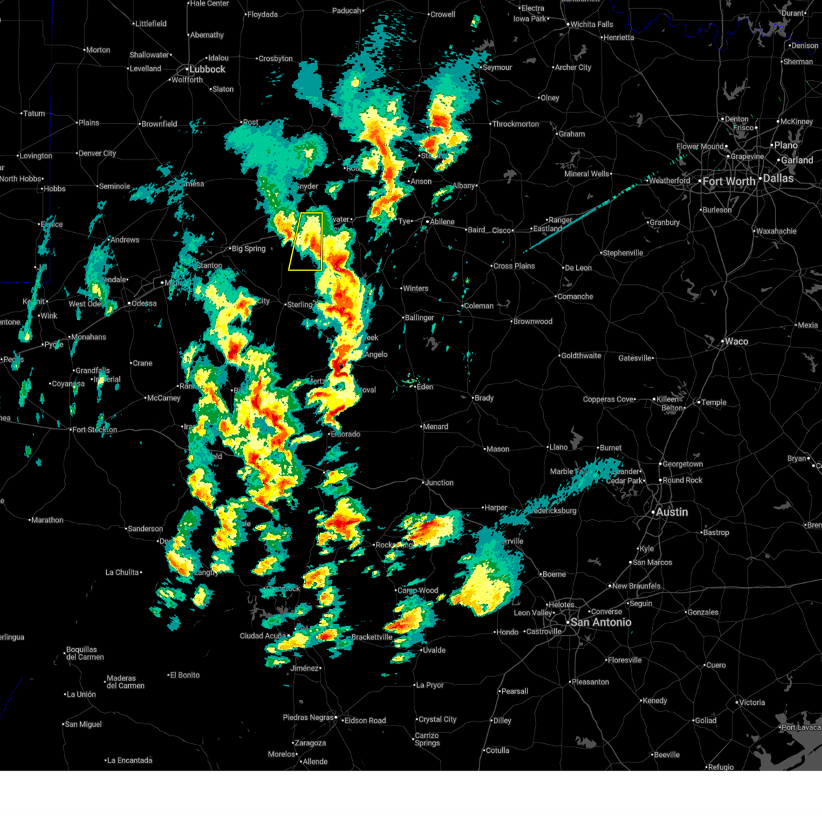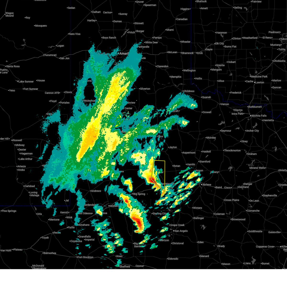 At 518 pm cdt, a severe thunderstorm was located near hermleigh, or 8 miles east of snyder, moving southeast at 35 mph. at 501 pm cdt, a gust of 81 mph occurred 3 miles south southwest of snyder. this is a very dangerous storm (radar indicated). Hazards include 80 mph wind gusts and golf ball size hail. Flying debris will be dangerous to those caught without shelter. mobile homes will be heavily damaged. expect considerable damage to roofs, windows, and vehicles. extensive tree damage and power outages are likely. locations impacted include, snyder, colorado city, china grove, valley view, loraine, hermleigh, inadale, colorado city airport, dunn, us-84 near the nolan-fisher county line, ira, i-20 near the nolan-mitchell county line and buford. This includes interstate 20 between mile markers 217 and 228.