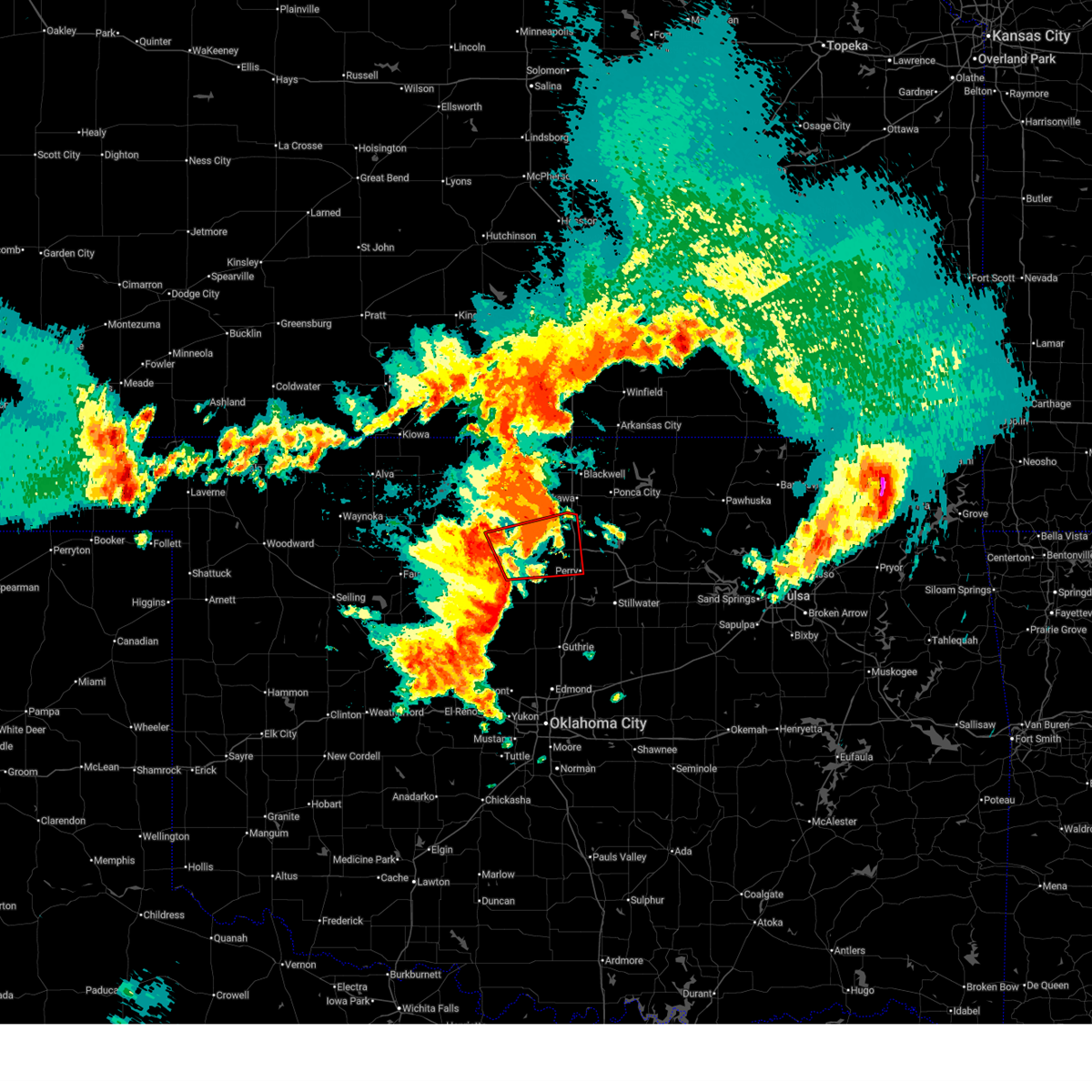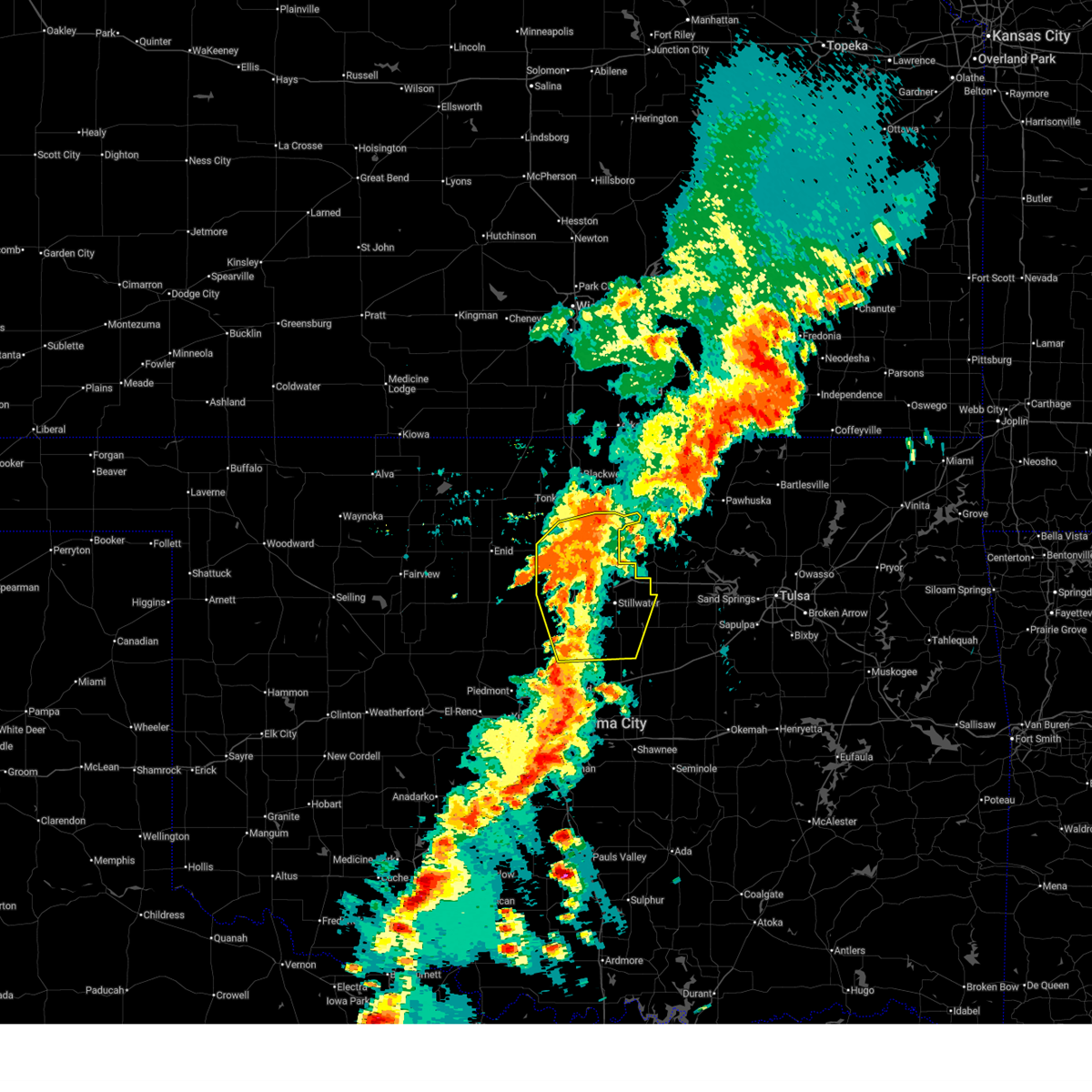 At 1032 pm cdt, a severe thunderstorm capable of producing a tornado was located near fairmont, moving east at 65 mph (radar indicated rotation). Hazards include tornado. Flying debris will be dangerous to those caught without shelter. mobile homes will be damaged or destroyed. damage to roofs, windows, and vehicles will occur. tree damage is likely. locations impacted include, enid, perry, garber, covington, billings, breckenridge, fairmont, douglas, lucien, north enid, and hayward. This includes interstate 35 between mile markers 186 and 207.