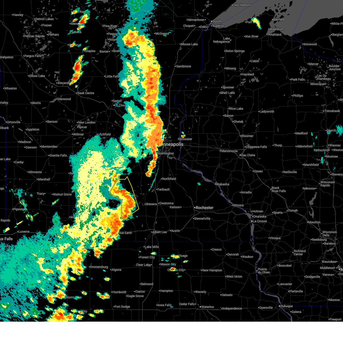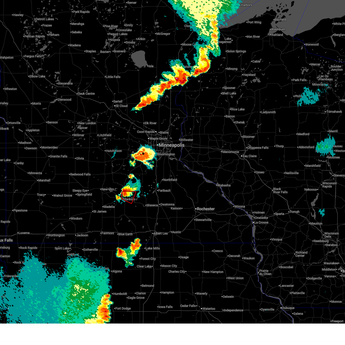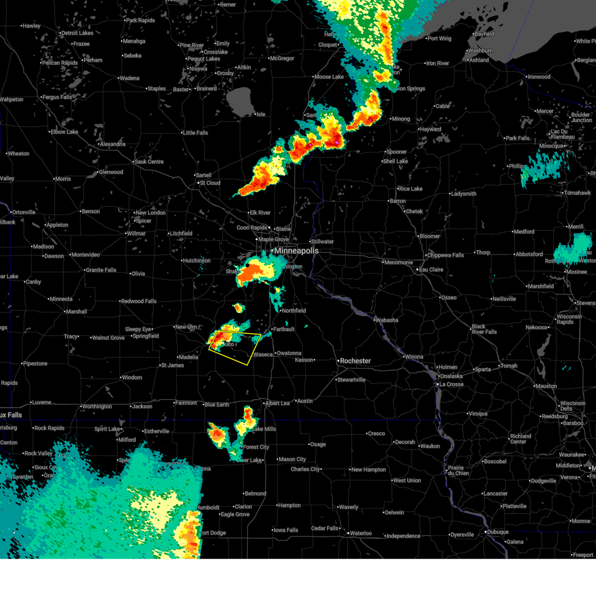 At 607 pm cdt, severe thunderstorms were located along a line extending from 6 miles east of lewisville to near amboy to near blue earth to near elmore, moving northeast at 65 mph. these are very dangerous storms (radar indicated). Hazards include 80 mph wind gusts. Flying debris will be dangerous to those caught without shelter. mobile homes will be heavily damaged. expect considerable damage to roofs, windows, and vehicles. extensive tree damage and power outages are likely. these severe storms will be near, mapleton and easton around 615 pm cdt. minnesota lake and good thunder around 620 pm cdt. mankato and pemberton around 625 pm cdt. eagle lake, wells, janesville, st. clair and waldorf around 630 pm cdt. madison lake around 635 pm cdt. elysian around 640 pm cdt. A tornado watch remains in effect until 1100 pm cdt for south central minnesota.