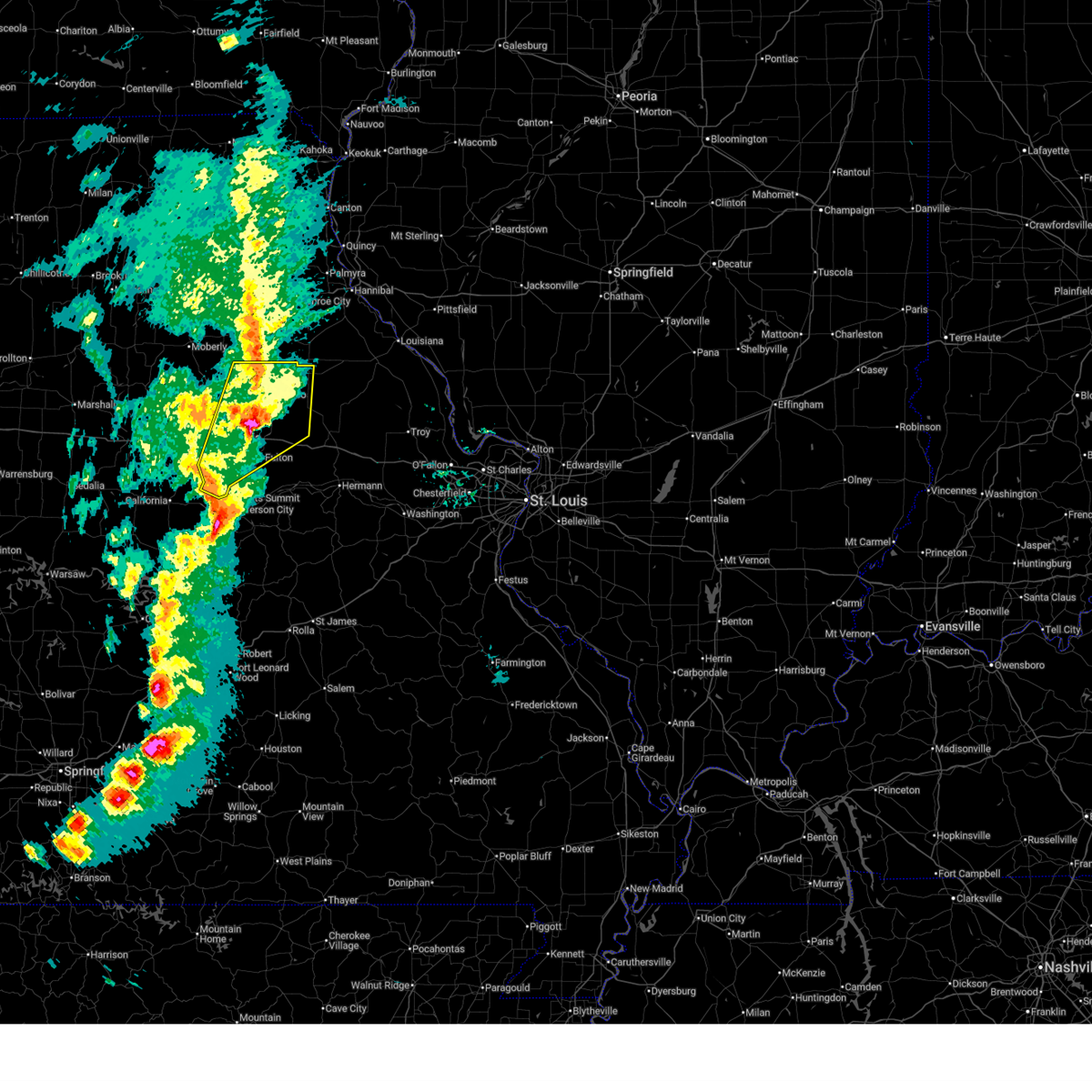 At 337 am cdt, severe thunderstorms were located along a line extending from near palmyra to near center to near mexico, moving east at 50 mph (a missouri mesonet in monroe city sited reported a wind gust of 74 mph). Hazards include 70 mph wind gusts and penny size hail. Expect considerable tree damage. damage is likely to mobile homes, roofs, and outbuildings. severe thunderstorms will be near, hannibal and spencerburg around 345 am cdt. fall creek, frankford and curryville around 350 am cdt. wellsville around 355 am cdt. other locations in the path of these severe thunderstorms include bowling green, tarrants, louisiana, barry, pike, buell, atlas, clarksville and pittsfield. this includes the following highways, interstate 172 between exits 2 and 10. interstate 72 between exits 4 and 31. this also includes siloam springs state park. thunderstorm damage threat, considerable hail threat, radar indicated max hail size, 0. 75 in wind threat, radar indicated max wind gust, 70 mph.