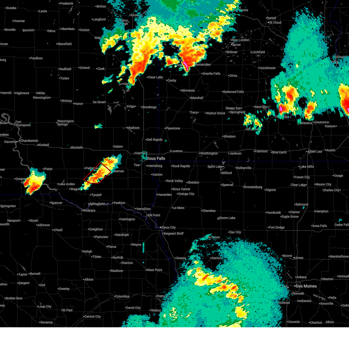 Svrfsd the national weather service in sioux falls has issued a * severe thunderstorm warning for, clay county in southeastern south dakota, minnehaha county in southeastern south dakota, lincoln county in southeastern south dakota, mccook county in southeastern south dakota, yankton county in southeastern south dakota, turner county in southeastern south dakota, northwestern union county in southeastern south dakota, eastern hutchinson county in southeastern south dakota, * until 830 pm cdt. * at 737 pm cdt, severe thunderstorms were located along a line extending from near emery to near freeman to mayfield to near crofton, moving east at 30 mph (radar indicated). Hazards include 70 mph wind gusts and quarter size hail. Hail damage to vehicles is expected. expect considerable tree damage. wind damage is also likely to mobile homes, roofs, and outbuildings. severe thunderstorms will be near, yankton, marion, bridgewater, mayfield, mission hill, and dolton around 740 pm cdt. irene around 745 pm cdt. parker, salem, canistota, volin, and monroe around 750 pm cdt. lake vermillion state recreation area, viborg, hurley, and wakonda around 755 pm cdt. Other locations in the path of these severe thunderstorms include centerville, montrose, chancellor, davis, humboldt, meckling, lennox, wall lake and tea.