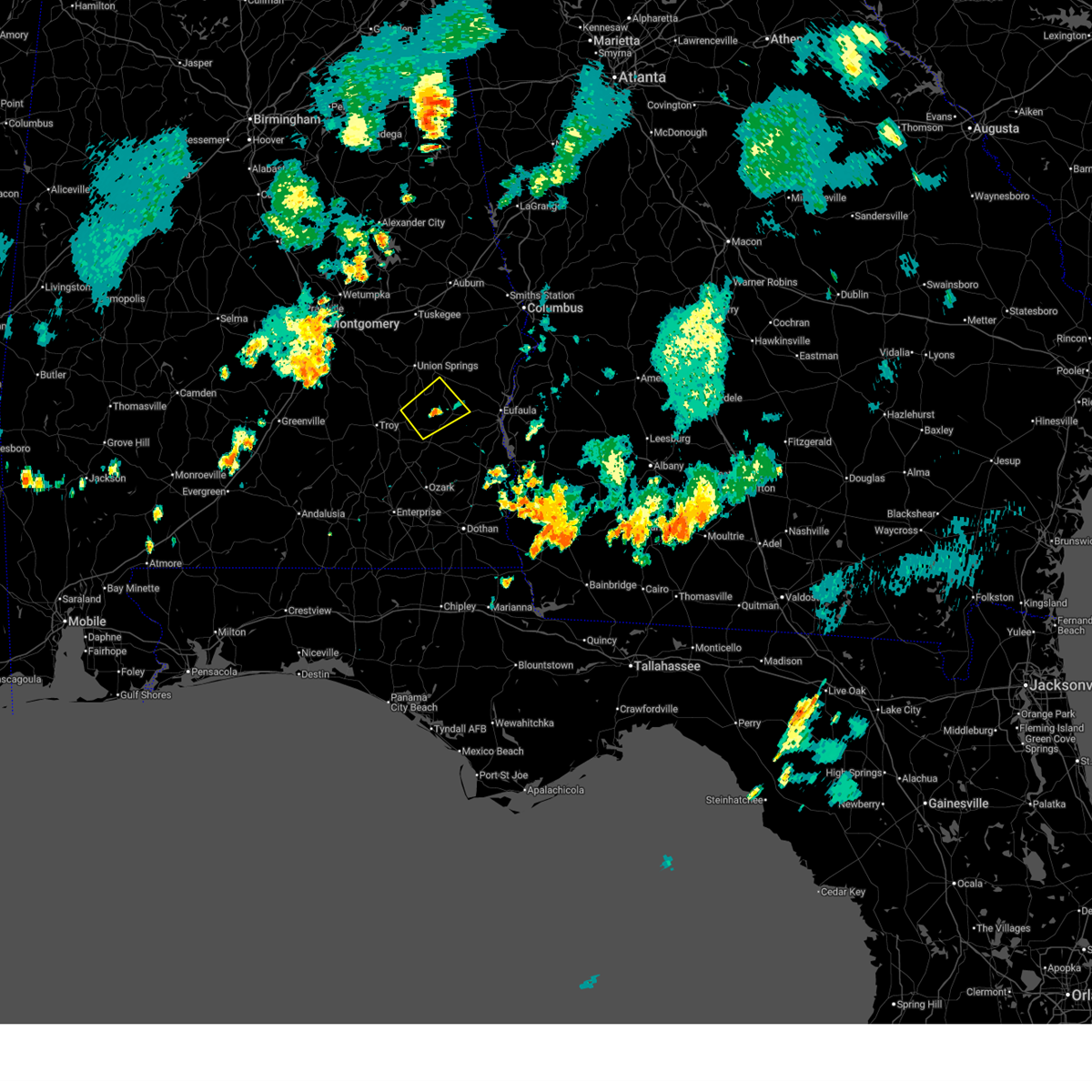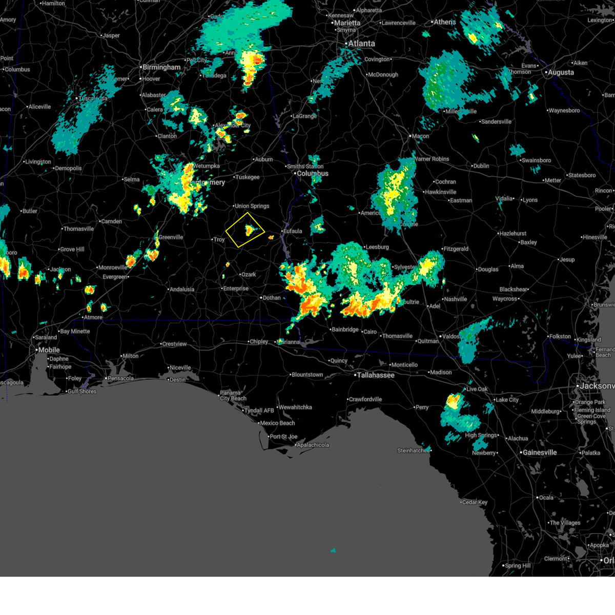 At 623 pm cst, severe thunderstorms were located along a line extending from tuskegee national forest to near franklin field to 7 miles south of brundidge, moving northeast at 55 mph (radar indicated). Hazards include 60 mph wind gusts. Expect damage to roofs. siding and trees. locations impacted include, troy, tuskegee, union springs, brundidge, notasulga, midway, banks, beans crossroads, pickett, lake tuskegee, davisville, society hill, troy university, tuskegee national forest, liverpool, antioch, franklin field, guerryton, aberfoil and linwood. this includes interstate 85 between mile markers 38 and 42. A tornado watch remains in effect until 900 pm cst for southeastern alabama.