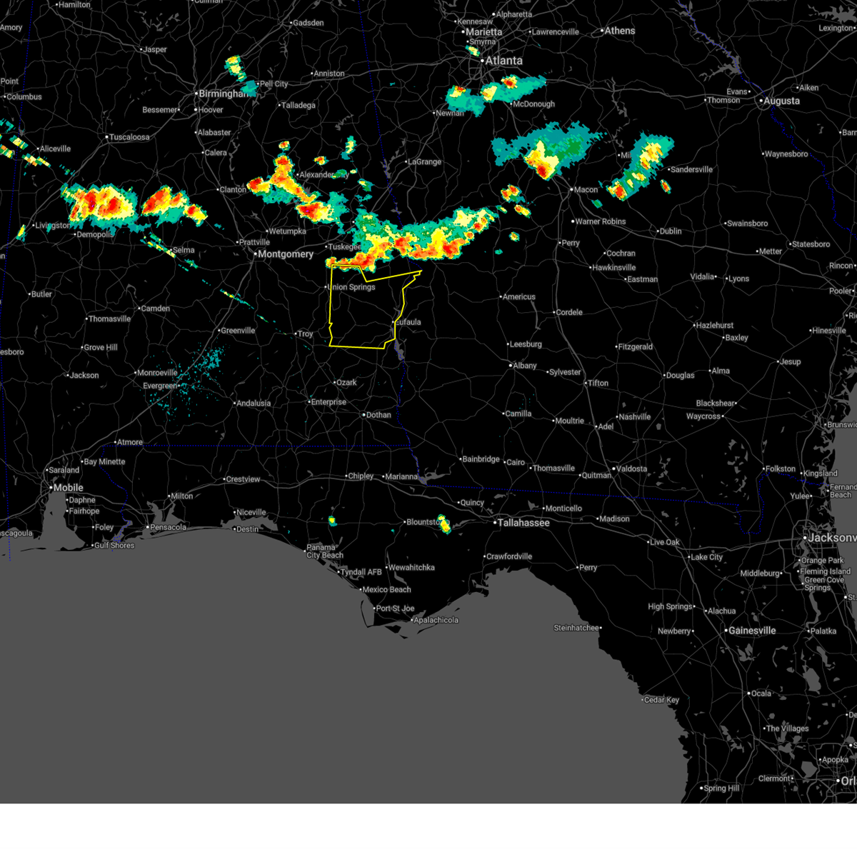 At 330 am cdt, severe thunderstorms were located along a line extending from midway to near blue springs state park, moving east at 60 mph (radar indicated). Hazards include 70 mph wind gusts and penny size hail. Expect considerable tree damage. damage is likely to mobile homes, roofs, and outbuildings. Locations impacted include, eufaula, clio, midway, clayton, louisville, blue springs, tyler crossroads, pickett, hawkinsville, spring hill, blue springs state park, osco, richards crossroads, white oak, boot hill, doster, gaino, comer, barbour county public lake dam, and texasville.