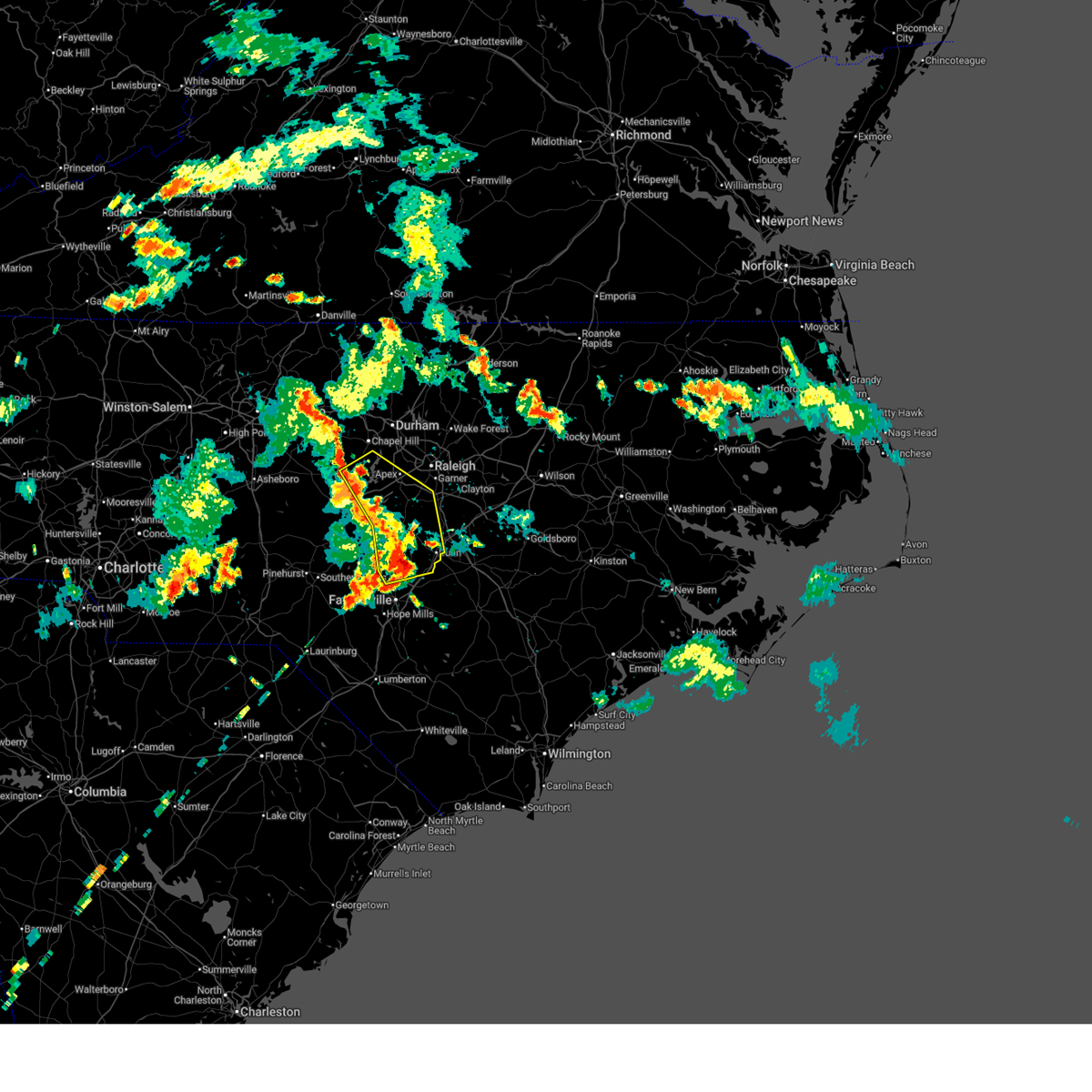At 1022 pm edt, severe thunderstorms were located along a line extending from near cary to 7 miles southwest of lillington to near fort bragg to near hoffman, moving east at 35 mph (radar indicated). Hazards include 60 mph wind gusts. Expect damage to roofs, siding, and trees. Locations impacted include, fayetteville, cary, sanford, lillington, fort bragg, garner, fuquay-varina, clayton, dunn, and angier.