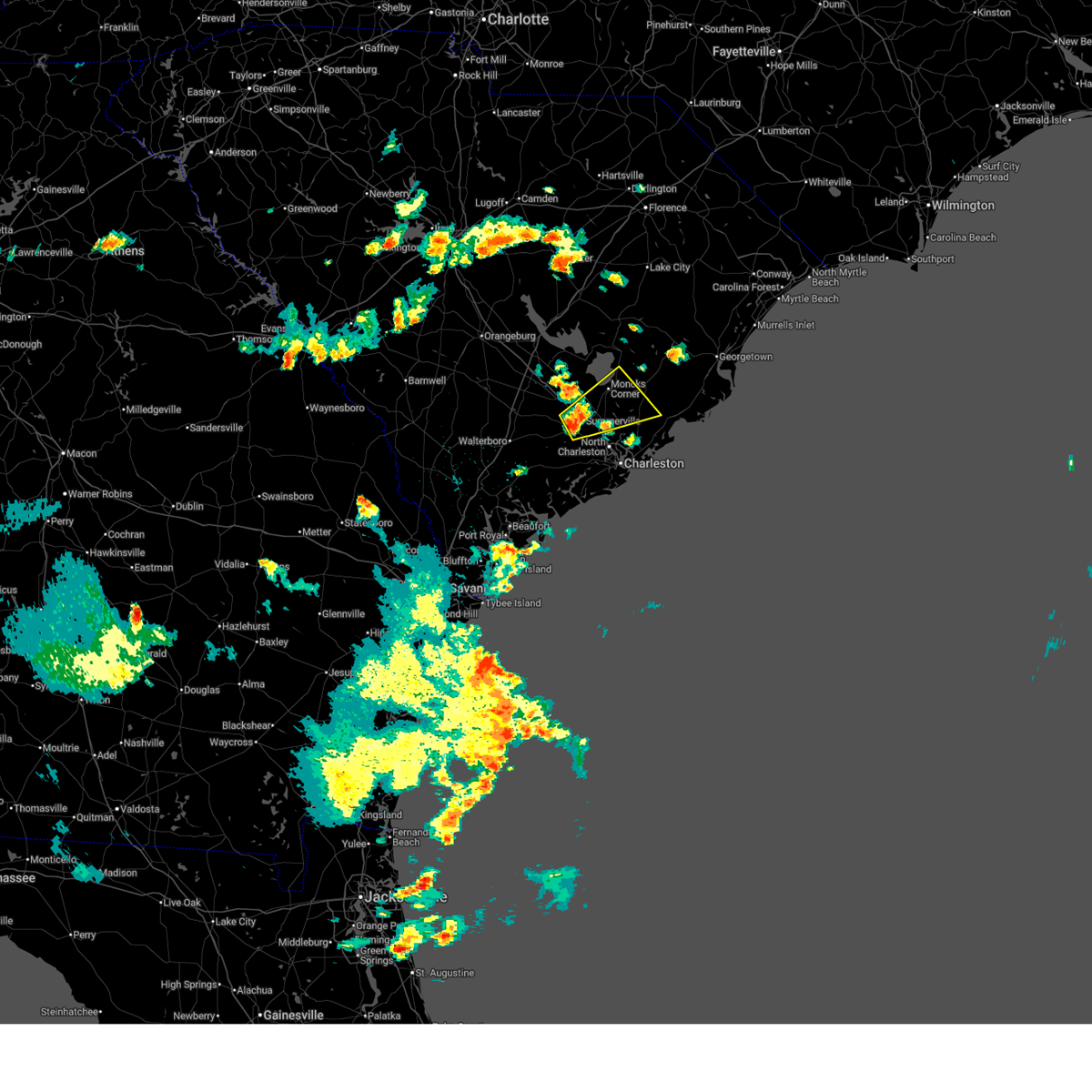 Svrchs the national weather service in charleston has issued a * severe thunderstorm warning for portions of, charleston county in southeastern south carolina, dorchester county in southeastern south carolina, * until 645 pm edt. * at 556 pm edt, a severe thunderstorm was located near summerville, moving north at 5 mph (radar indicated). Hazards include 60 mph wind gusts and small hail. expect damage to roofs, siding, and trees