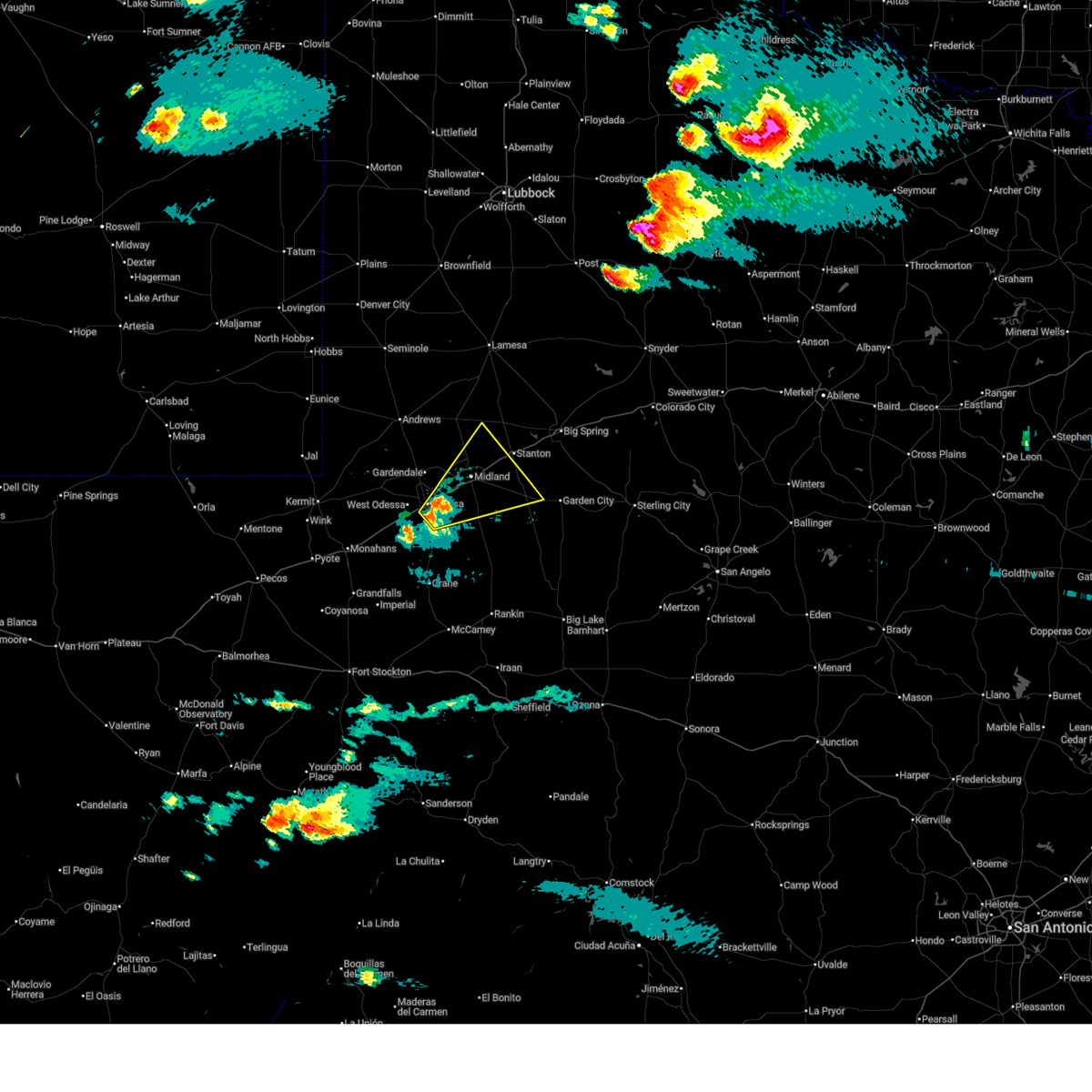 At 435 pm cdt, a severe thunderstorm was located 6 miles north of pleasant farms, and moving northeast at 25 mph (trained weather spotters). Hazards include 60 mph wind gusts and quarter size hail. Hail damage to vehicles is expected. expect wind damage to roofs, siding and trees. Locations impacted include, odessa, midland, odessa schelemeyer field, mission dorado, warfield, midland international, cotton flat, midland airpark, valley view and skywest airport.