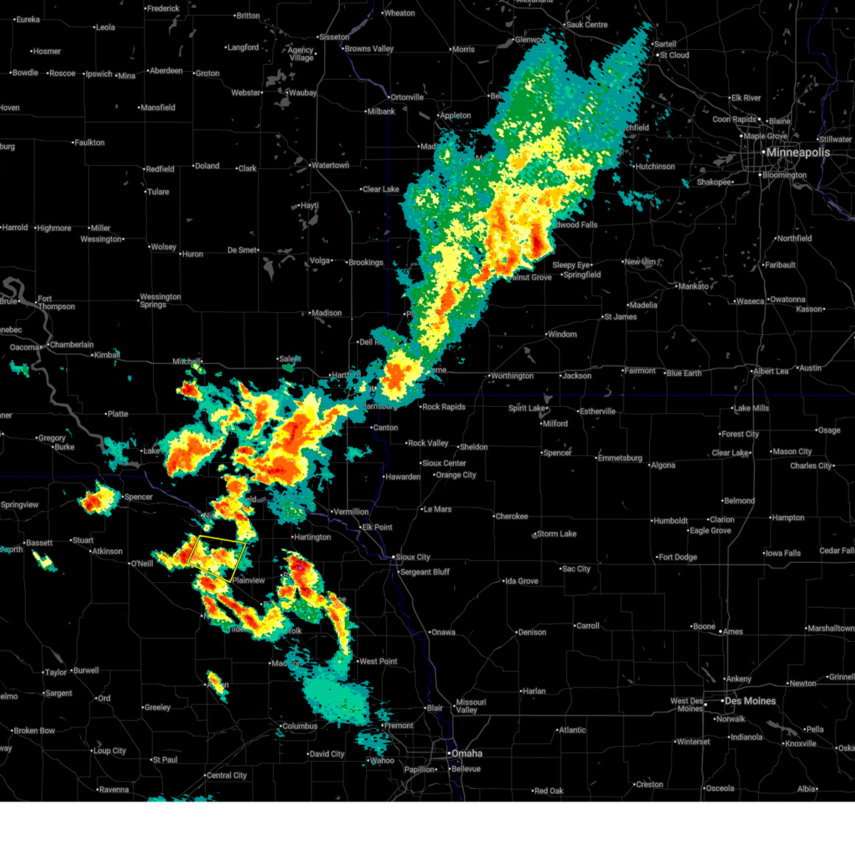 At 1004 pm cdt, severe thunderstorms were located along a line extending from 3 miles north of emerson to 6 miles northwest of verdigre, moving southwest at 30 mph (radar indicated). Hazards include 60 mph wind gusts and nickel size hail. Expect damage to roofs. siding and trees. locations impacted include, hartington, plainview, creighton, bloomfield, randolph, osmond, wausa, verdigre, coleridge, orchard, niobrara, santee, wynot, laurel, crofton, pleasant valley, fordyce, brunswick, belden and st. helena. this includes the following highways, highway 81 in nebraska between milemarkers 177 and 215. Highway 20 in nebraska between mile markers 329 and 398.