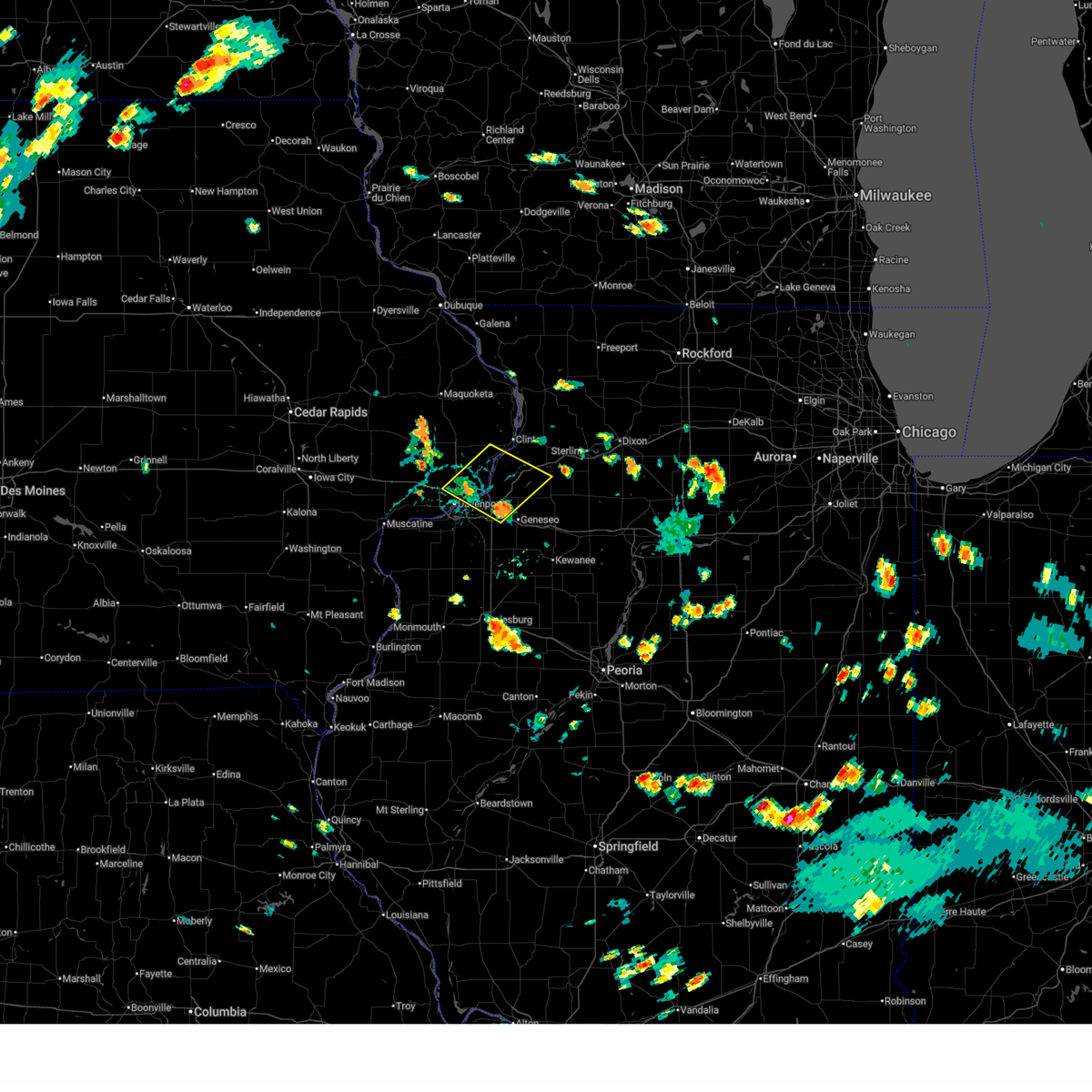 At 721 pm cdt, a severe thunderstorm capable of producing a tornado was located over silvis, or over east moline, moving east at 45 mph (radar indicated rotation). Hazards include tornado and half dollar size hail. Flying debris will be dangerous to those caught without shelter. mobile homes will be damaged or destroyed. damage to roofs, windows, and vehicles will occur. tree damage is likely. this dangerous storm will be near, colona around 725 pm cdt. le claire, rapids city, cleveland and osborn around 730 pm cdt. port byron around 735 pm cdt. geneseo around 740 pm cdt. other locations impacted by this tornadic thunderstorm include panorama park, silvis heights, illiniwek forest preserve, joslin, fishermans corner, mississippi valley fairgrounds, morristown, hillsdale, pleasant valley and coyne center. this includes the following highways, interstate 74 in iowa between mile markers 3 and 5. interstate 80 in iowa between mile markers 305 and 306. interstate 80 in illinois between mile markers 1 and 22. interstate 74 in illinois between mile markers 2 and 3. interstate 88 between mile markers 1 and 13. Interstate 280 between mile markers 6 and 18.