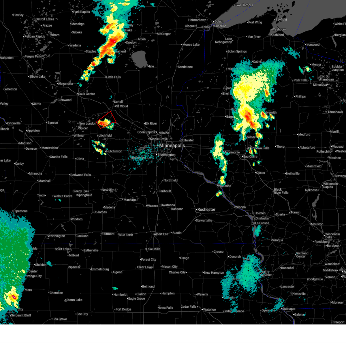 At 1030 pm cdt, severe thunderstorms were located along a line extending from belgrade to near pennock to gluek, moving east at 45 mph (radar indicated). Hazards include 70 mph wind gusts and quarter size hail. Hail damage to vehicles is expected. expect considerable tree damage. wind damage is also likely to mobile homes, roofs and outbuildings. severe thunderstorms will be near, willmar and belgrade around 1035 pm cdt. new london and spicer around 1045 pm cdt. paynesville, raymond and prinsburg around 1050 pm cdt. atwater around 1055 pm cdt. richmond and grove city around 1100 pm cdt. litchfield and cold spring around 1110 pm cdt. rockville and cosmos around 1115 pm cdt. other locations impacted by these severe thunderstorms include lake henry, forest city, georgeville, kandiyohi, svea, hawick, lake koronis regional park, norway lake, willmar airport and lake lillian. this includes the following highways, u. s. highway 12 between mile markers 69 and 105. u. s. highway 8 in minnesota near mile marker 6. u. s. Highway 71 between mile markers 108 and 147.