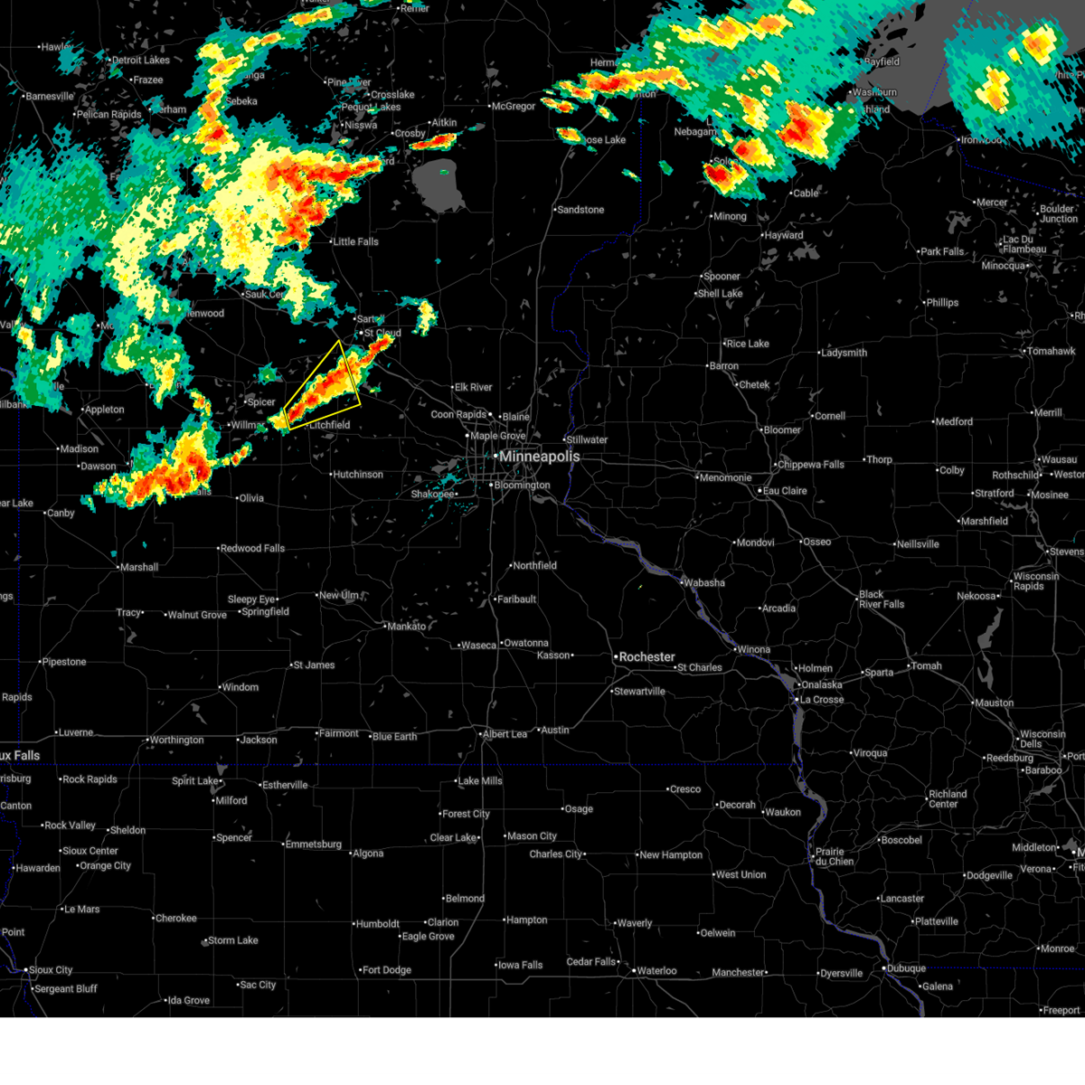 Tormpx the national weather service in the twin cities has issued a * tornado warning for, northeastern meeker county in central minnesota, southeastern stearns county in central minnesota, northwestern wright county in central minnesota, * until 415 pm cdt. * at 339 pm cdt, a severe thunderstorm capable of producing a tornado was located 6 miles north of litchfield, or 24 miles north of hutchinson, moving northeast at 50 mph (radar indicated rotation). Hazards include tornado and half dollar size hail. Flying debris will be dangerous to those caught without shelter. mobile homes will be damaged or destroyed. damage to roofs, windows and vehicles will occur. Tree damage is likely.