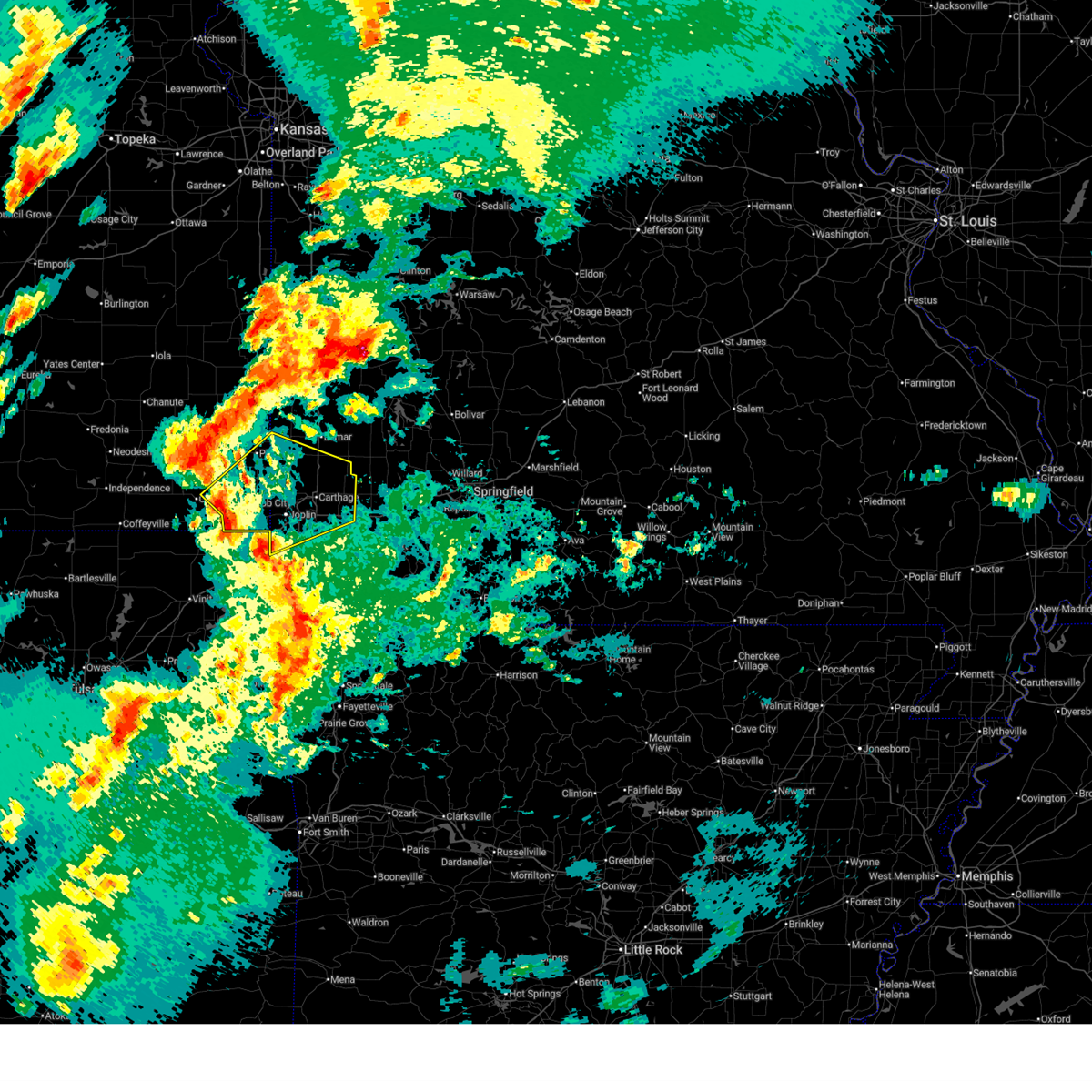At 958 pm cst, severe thunderstorms were located along a line extending from 12 miles west of stockton to near carl junction, moving east at 60 mph (public. the joplin airport just reported a 61 mph wind gust in the past few minutes. numerous reports of wind damage have been reported with these storms). Hazards include 70 mph wind gusts and quarter size hail. Hail damage to vehicles is expected. expect considerable tree damage. Wind damage is also likely to mobile homes, roofs, and outbuildings.