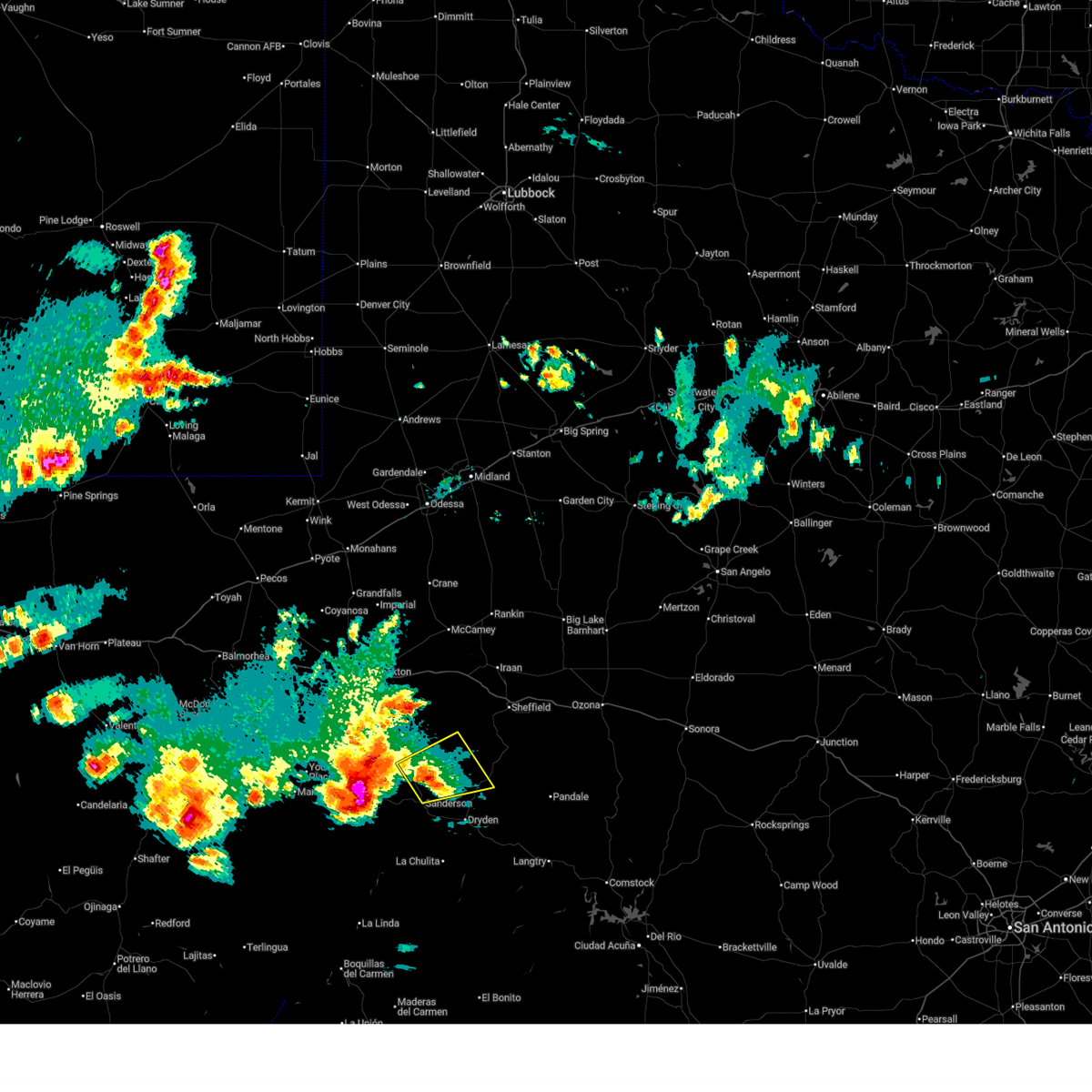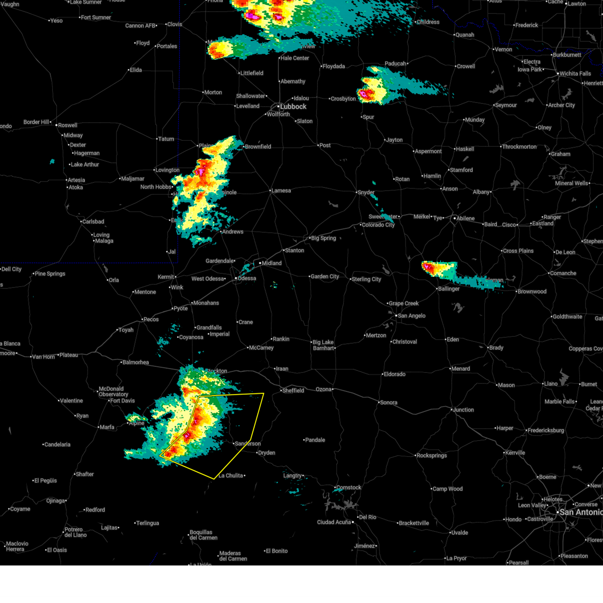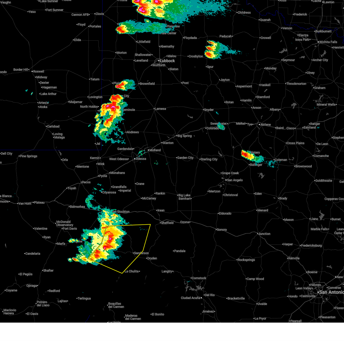 At 814 pm cdt, a severe thunderstorm was located 7 miles south of sanderson, moving southeast at 25 mph (trained weather spotters). Hazards include 60 mph wind gusts and quarter size hail. Hail damage to vehicles is expected. expect wind damage to roofs, siding, and trees. Locations impacted include, dryden, sanderson and terrell county airport.