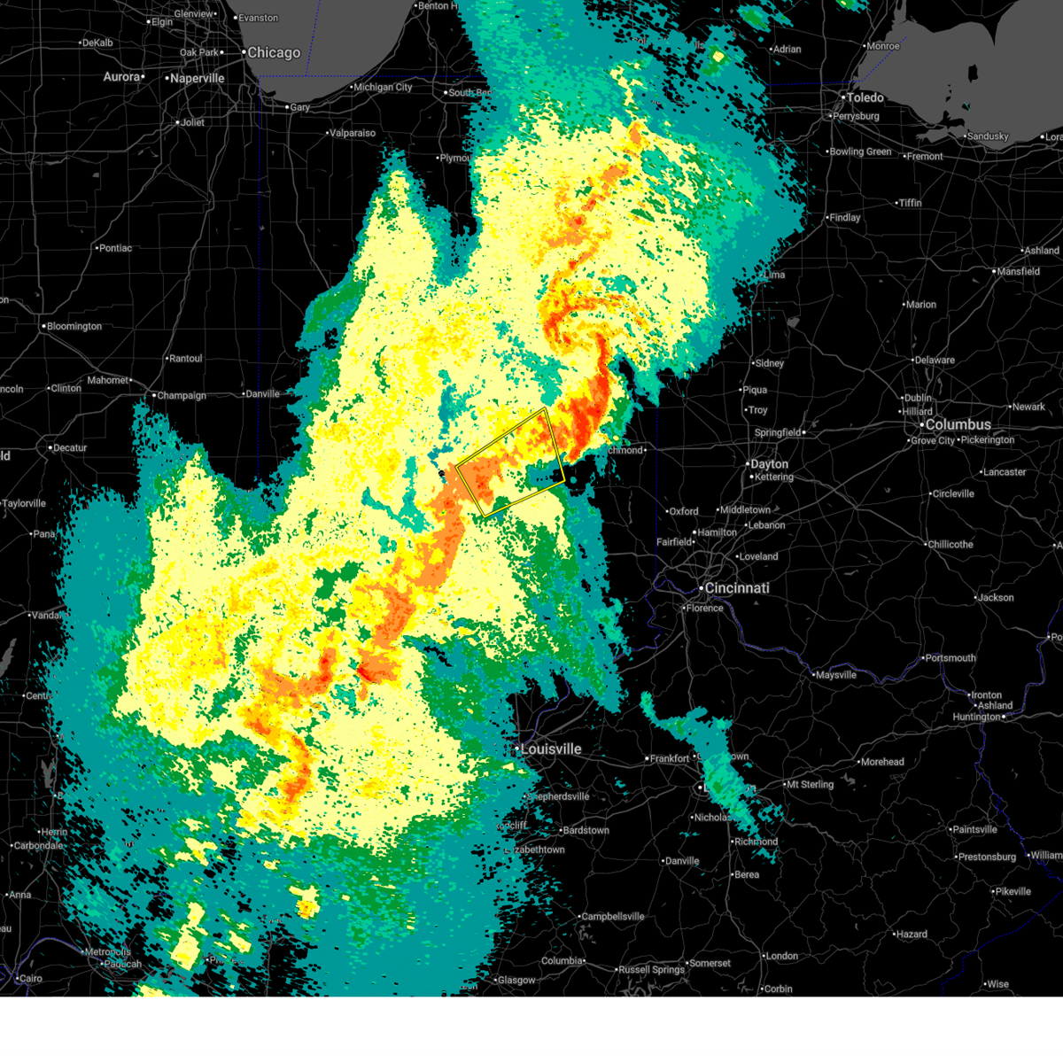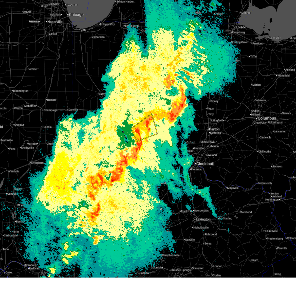 56kt gust recorded at kge in shelby county IN, 4.3 miles SSE of Shelbyville, IN