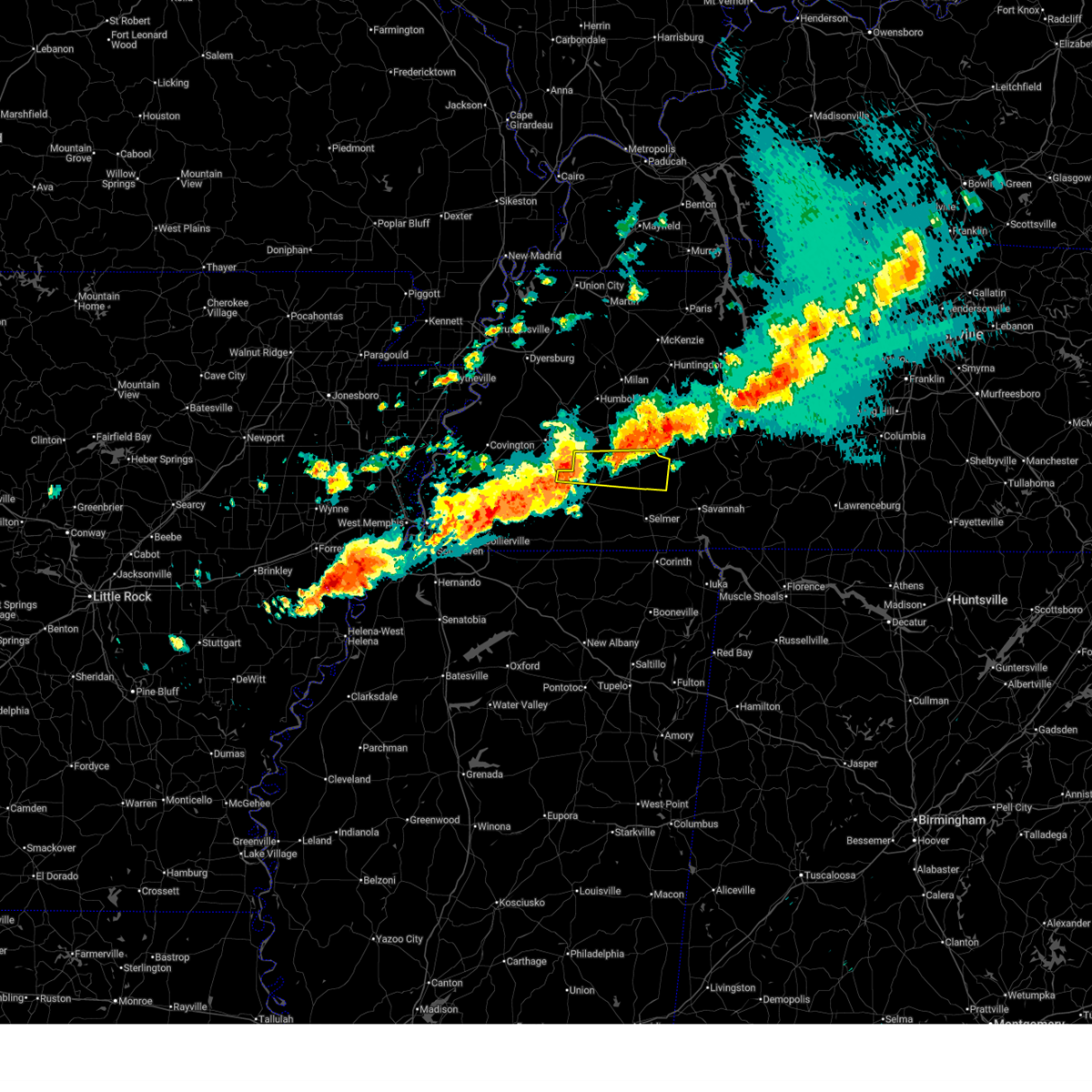 At 1213 am cdt, a severe thunderstorm capable of producing a tornado was located 8 miles northeast of canaan, or 15 miles west of big hill pond state park, moving northeast at 50 mph (radar indicated rotation). Hazards include tornado and ping pong ball size hail. Flying debris will be dangerous to those caught without shelter. mobile homes will be damaged or destroyed. damage to roofs, windows, and vehicles will occur. tree damage is likely. Locations impacted include, chalybeate, rose creek, selmer, pocahontas, pine top, eastview, wenasoga, guys, hickory valley, chickasaw state forest, silerton, acton, teague, bolivar, hebron, hamilton, middleton, ramer, van buren, and chewalla.