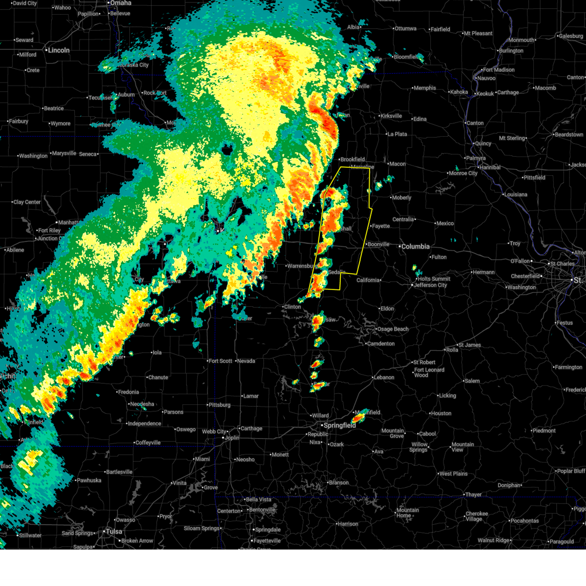 At 1253 pm cdt, a severe thunderstorm was located near slater, moving east at 20 mph. this is a very dangerous storm (trained weather spotters). Hazards include baseball size hail and 60 mph wind gusts. People and animals outdoors will be severely injured. expect shattered windows, extensive damage to roofs, siding, and vehicles. Locations impacted include, slater, glasgow, gilliam and arrow rock.
