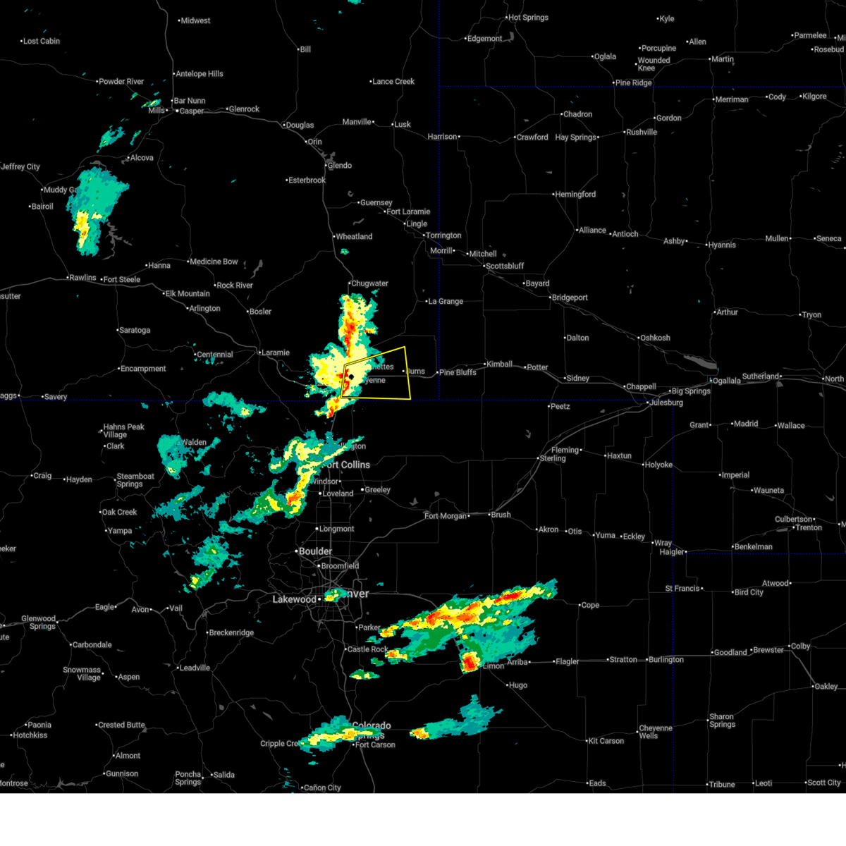 At 800 pm mdt, severe thunderstorms were located along a line extending from near whitaker to near north cheyenne to near warren afb to near silver sage estates, moving southeast at 25 mph. these are destructive storms for the far northern suburbs of cheyenne (radar indicated). Hazards include 80 mph wind gusts and quarter size hail. Flying debris will be dangerous to those caught without shelter. mobile homes will be heavily damaged. expect considerable damage to roofs, windows, and vehicles. extensive tree damage and power outages are likely. Locations impacted include, cheyenne, rocking star ranch, silver sage estates, laramie county fairgrounds at archer, ranchettes, fox farm-college, cheyenne regional airport, warren afb, frontier park, north cheyenne, south cheyenne, and south greeley highway.