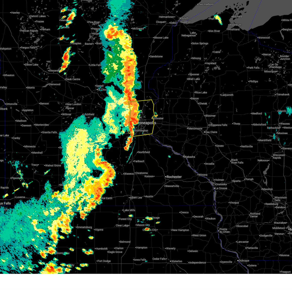 At 1226 am cdt, severe thunderstorms were located along a line extending from near big lake to wayzata to near flying cloud airport, moving east at 45 mph (radar indicated). Hazards include 60 mph wind gusts. Expect damage to roofs. siding and trees. severe thunderstorms will be near, plymouth, eden prairie, minnetonka, st. louis park and shakopee around 1230 am cdt. minneapolis, edina, brooklyn center and golden valley around 1235 am cdt. burnsville, richfield and columbia heights around 1240 am cdt. bloomington, roseville, st. michael, otsego and st. francis around 1245 am cdt. eagan, ramsey, champlin, rosemount and mendota heights around 1250 am cdt. st. paul, maplewood, inver grove heights, andover and south st. paul around 1255 am cdt. coon rapids, cottage grove, oakdale, ham lake and st. paul park around 100 am cdt. woodbury, lake elmo and afton around 105 am cdt. other locations impacted by these severe thunderstorms include north minneapolis, flying cloud airport, south st paul airport, afton state park, lakeland shores, new hope, north st. paul, south st paul, como park and st paul park. this includes the following highways, interstate 35 between mile markers 128 and 133. interstate 94 in minnesota between mile markers 194 and 258. u. s. highway 10 in minnesota between mile markers 195 and 302. u. s. highway 12 between mile markers 153 and 156. u. s. highway 169 between mile markers 118 and 165. u. s. highway 212 between mile markers 155 and 162. u. s. highway 8 in minnesota between mile markers 0 and 1. u. s. Highway 61 between mile markers 119 and 162.