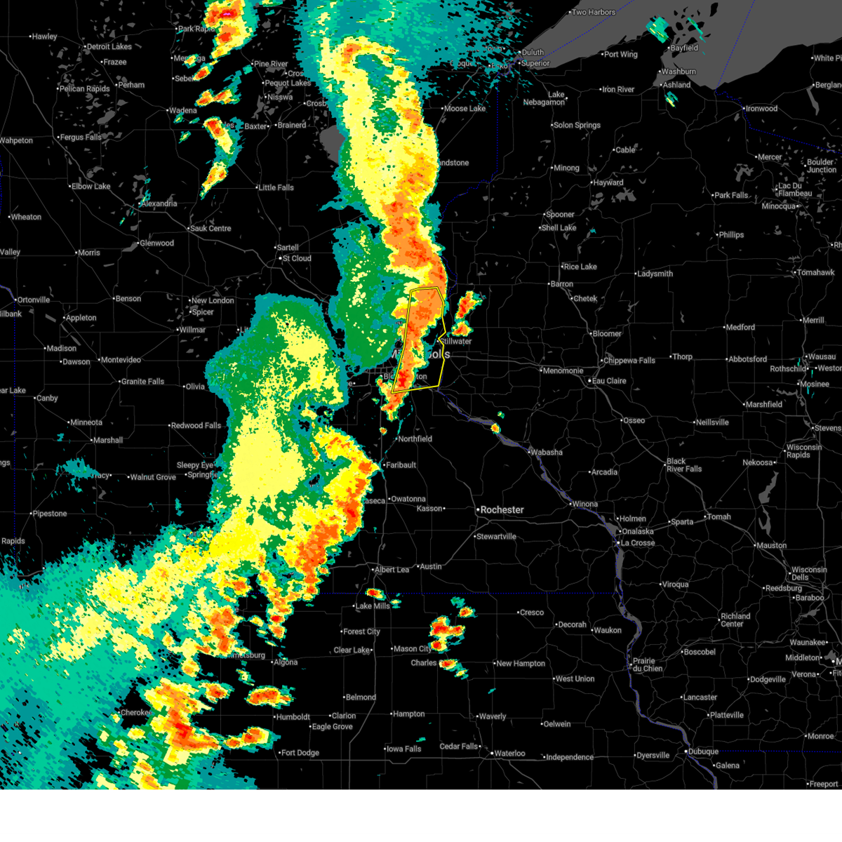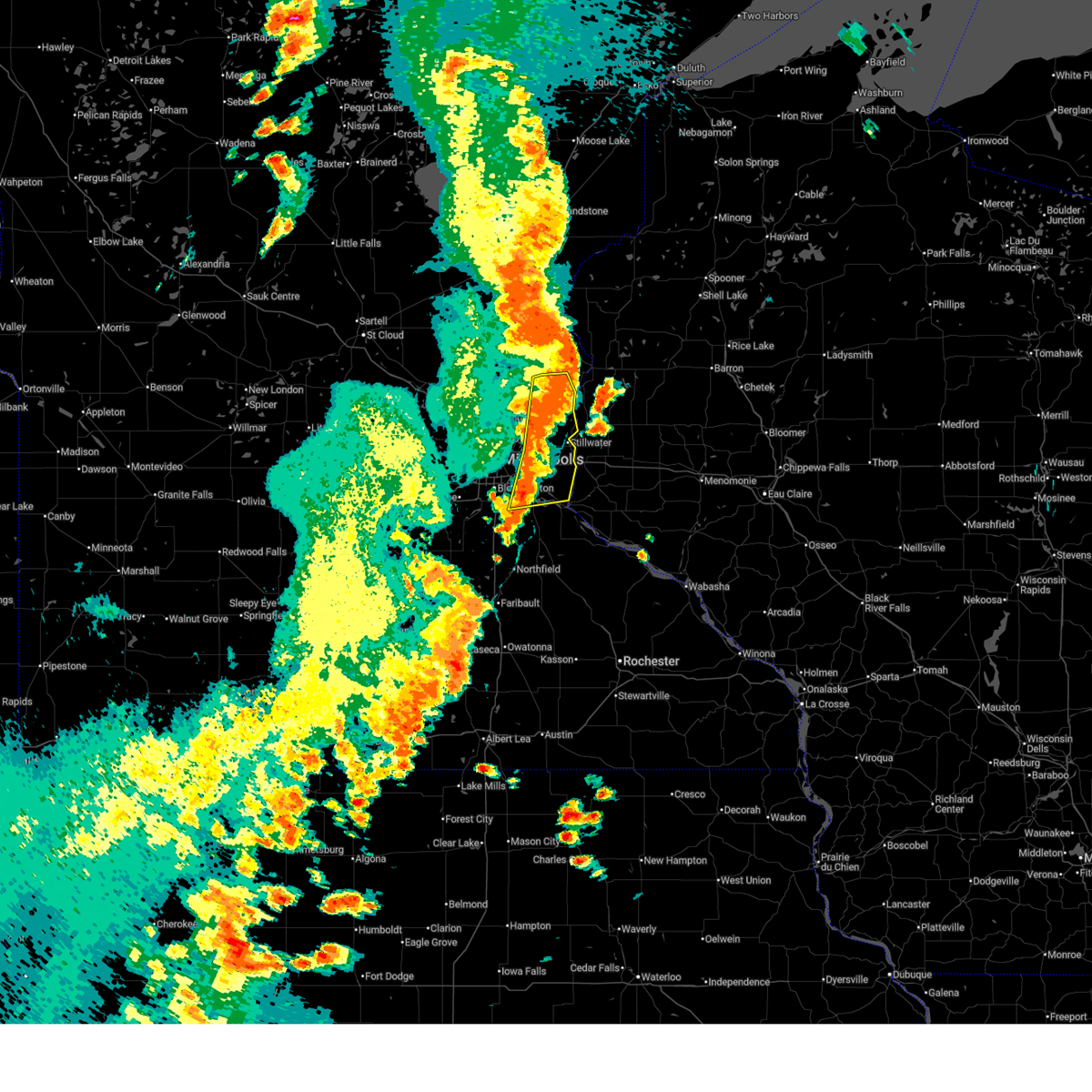 At 1254 am cdt, severe thunderstorms were located along a line extending from grey cloud township to near northfield to near waldorf, moving east at 45 mph (radar indicated). Hazards include 70 mph wind gusts. Expect considerable tree damage. damage is likely to mobile homes, roofs and outbuildings. severe thunderstorms will be near, northfield, cottage grove, st. paul park, stanton and randolph around 100 am cdt. hastings and cannon falls around 105 am cdt. prescott around 110 am cdt. river falls and ellendale around 120 am cdt. goodhue around 125 am cdt. ellsworth around 130 am cdt. blooming prairie around 135 am cdt. stockholm and frontenac around 145 am cdt. Other locations impacted by these severe thunderstorms include lemond, frontenac state park, bixby, afton state park, owatonna airport, hader, clinton falls, bridgewater, st paul park and diamond bluff.